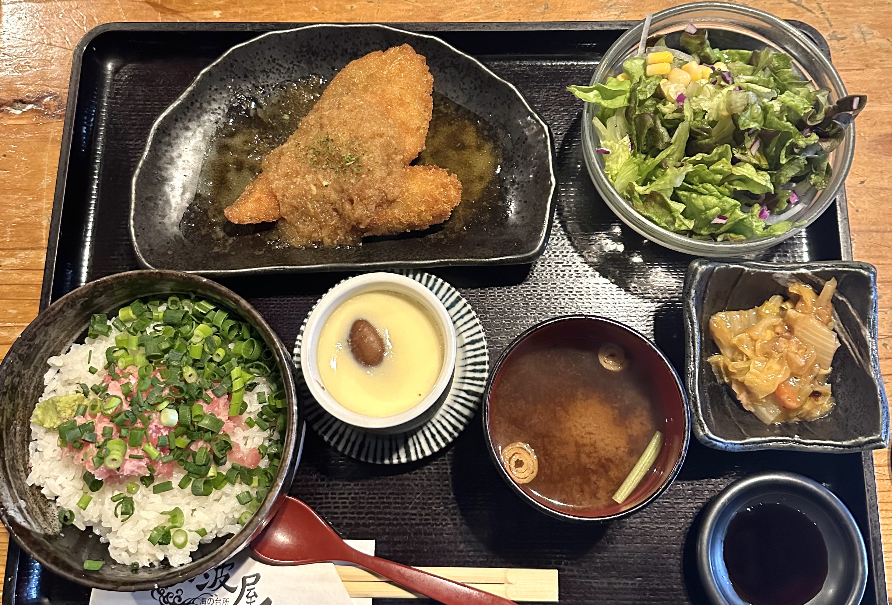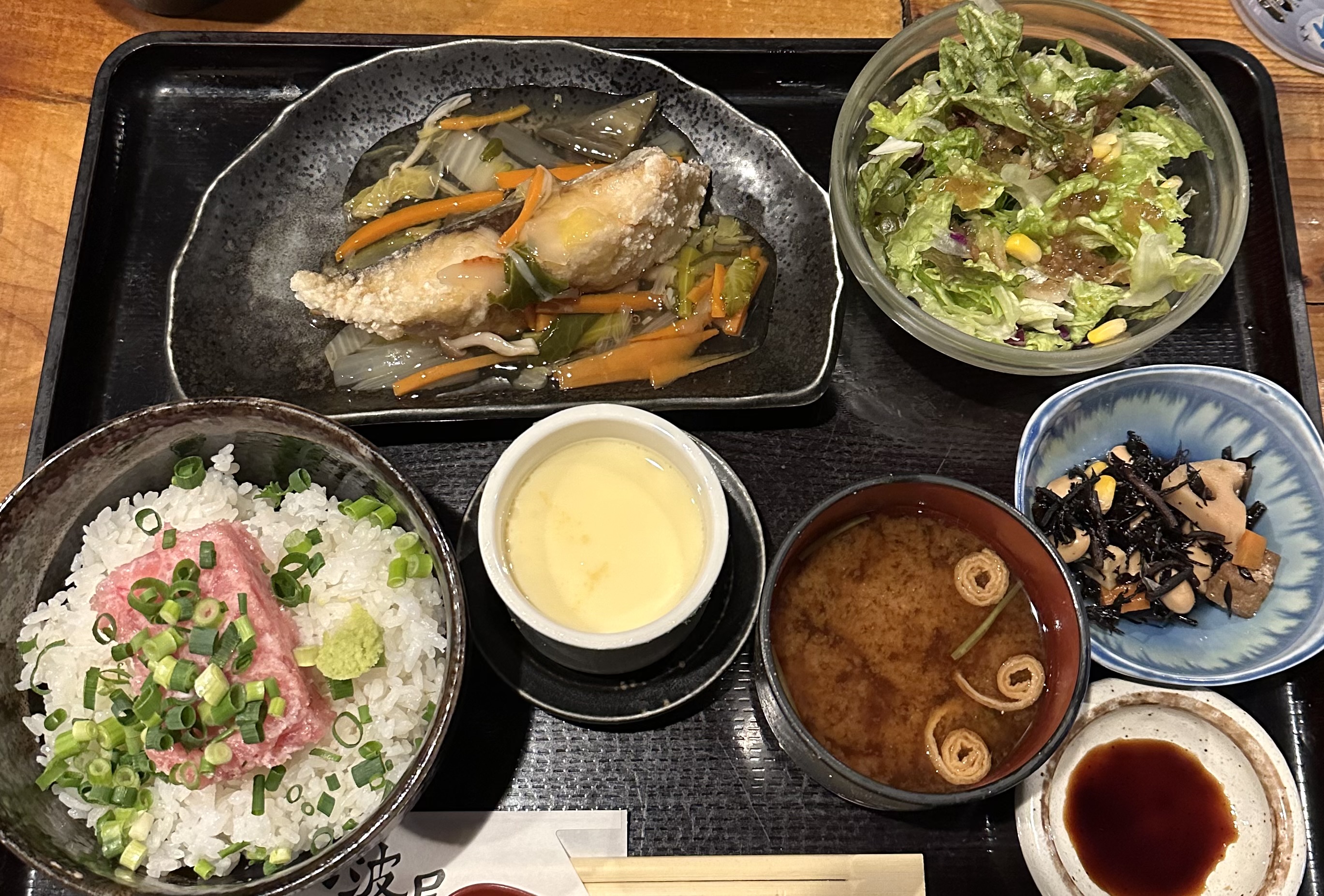 朝はフルグラ、昼はサワラの竜田揚げ野菜あんかけソース夜は飲み会(大寅)※一部の写真