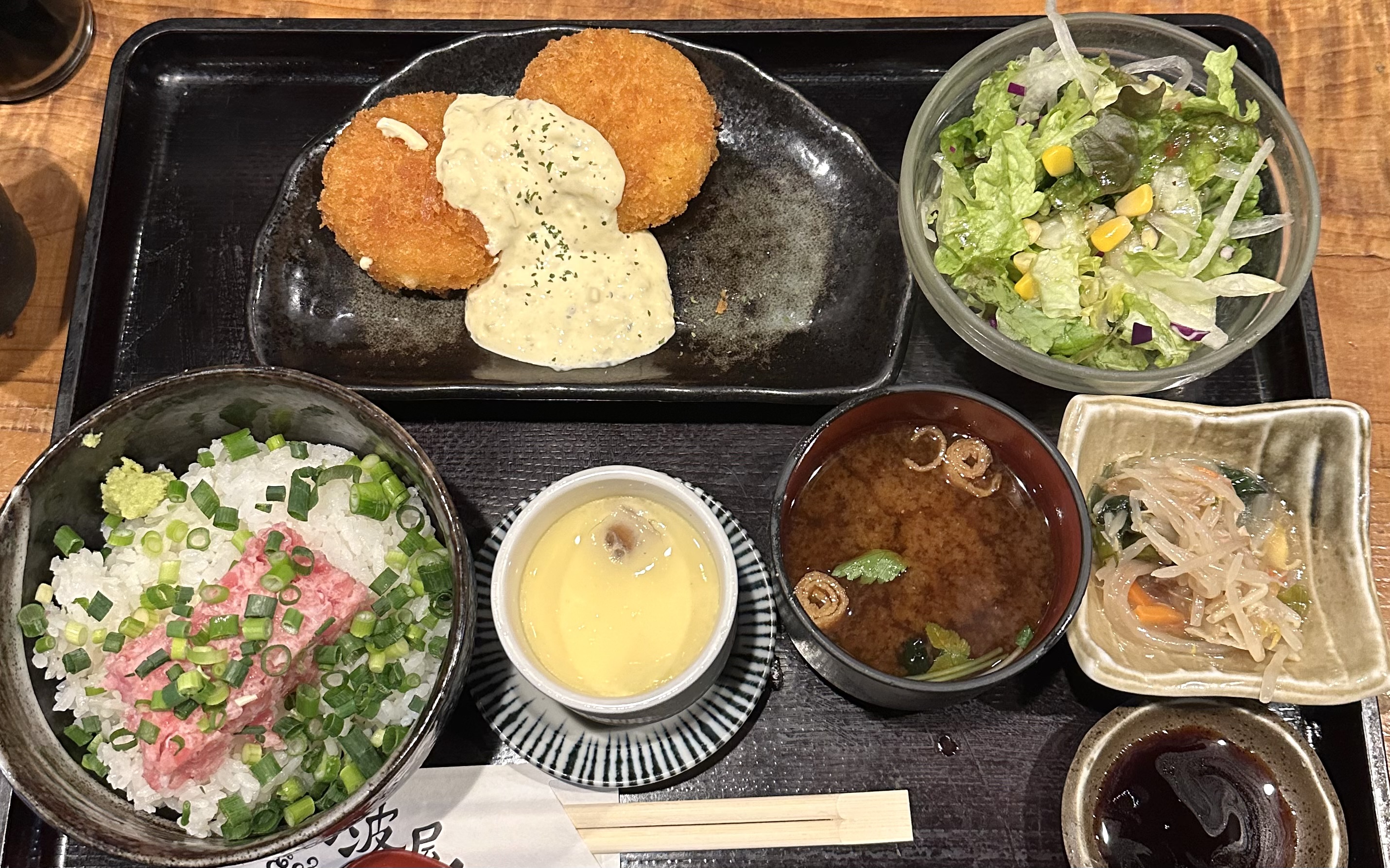 朝はフルグラ、昼はホタテのクリームコロッケタルタルソース+ネギトロ丼定食夜は鍋(鶏塩)+納豆