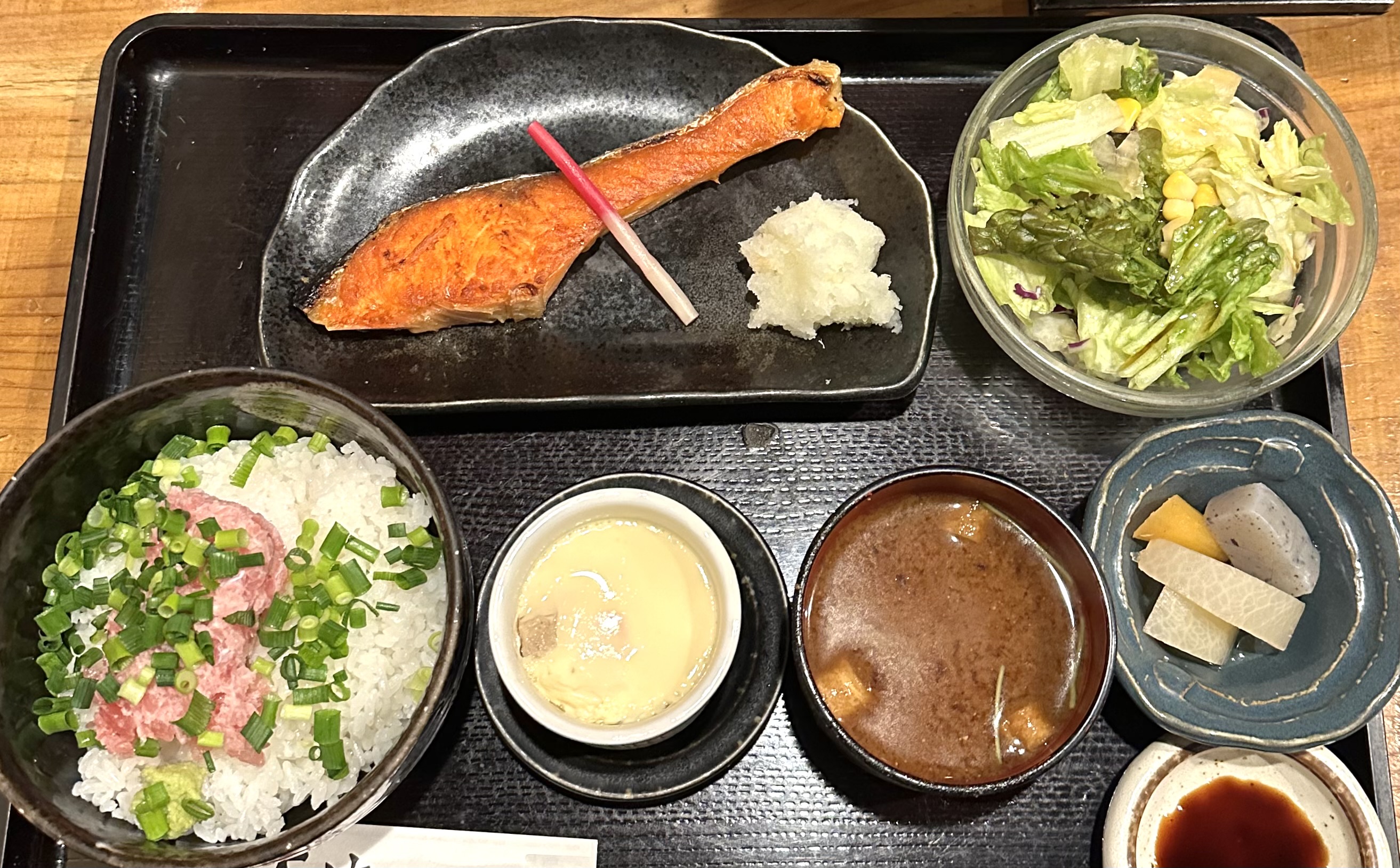 朝はフルグラ、昼は塩銀鮭焼き+ネギトロ丼定食夜は野菜豚丼