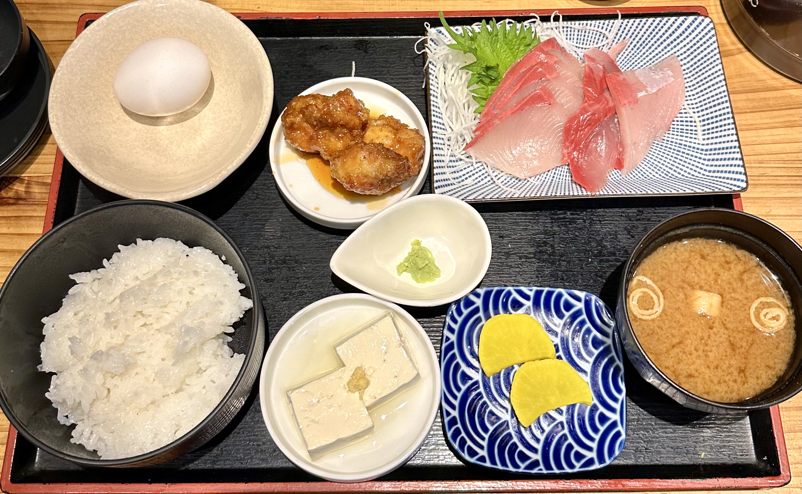 朝はフルグラ、昼はブリの刺身+鶏から定食夜はチャーハン+サラダ