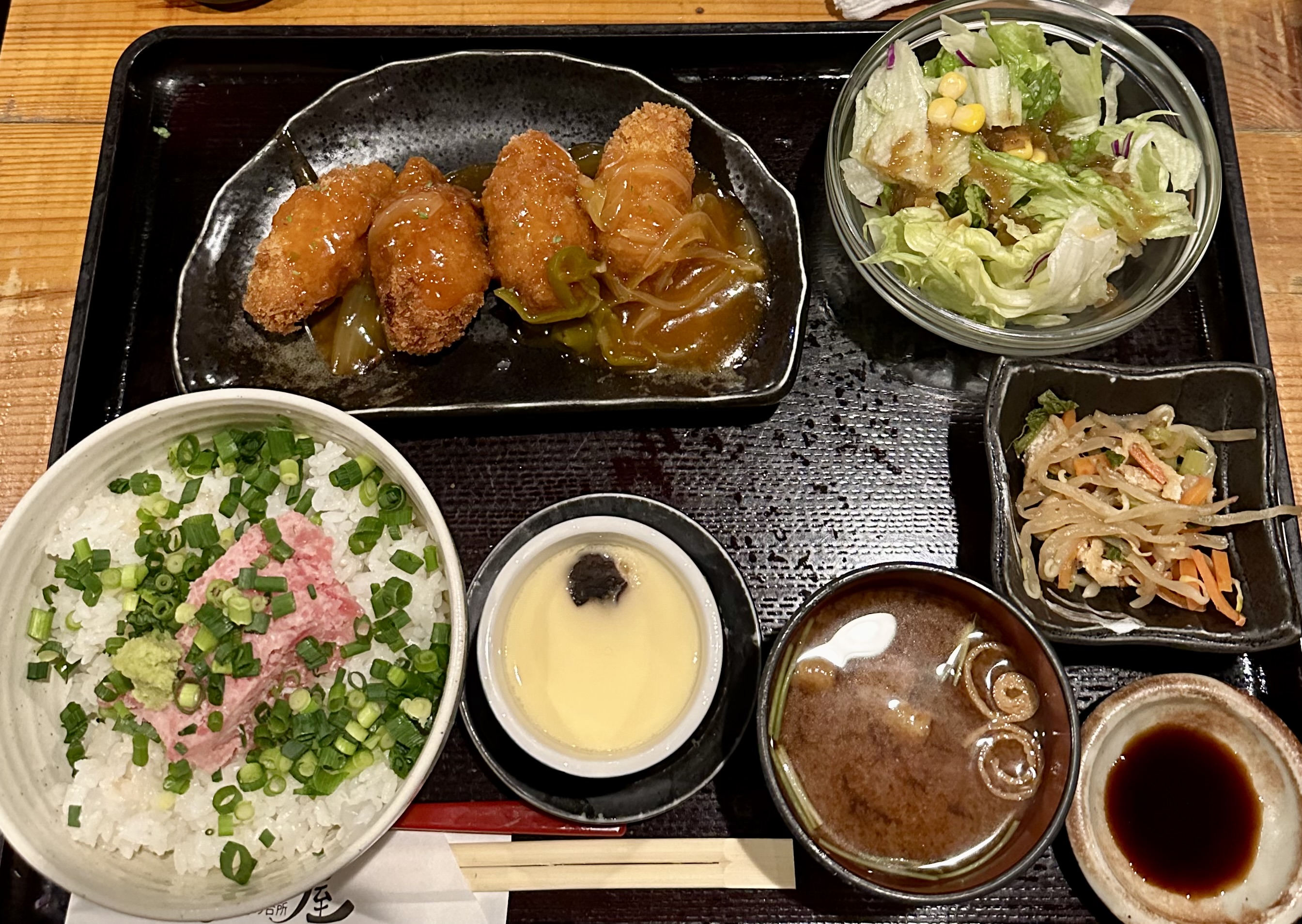 朝はフルグラ、昼はカキフライのチリソース+ネギトロ丼定食夜はパリパリ麺サラダ+焼きそば