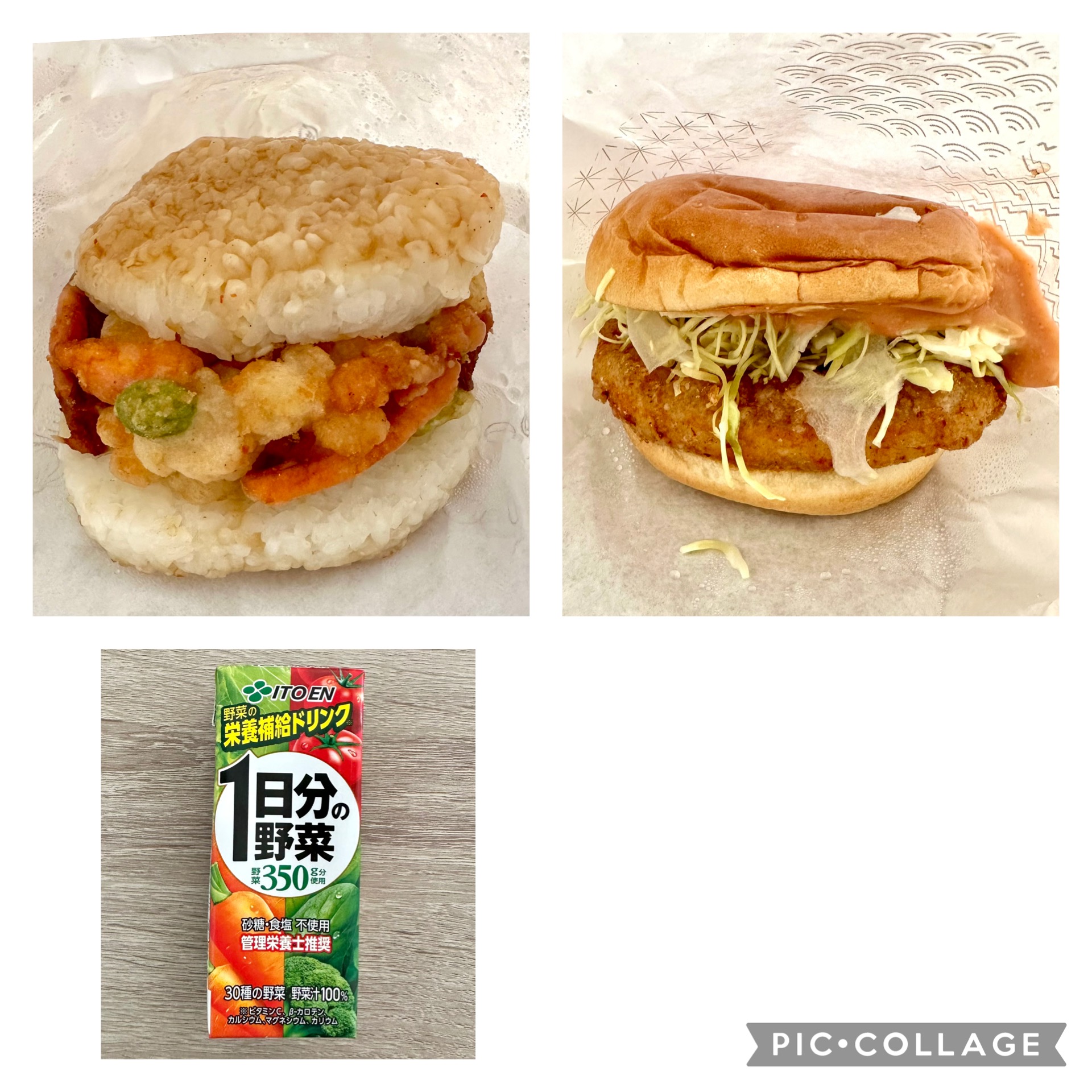 フルグラ+ヨーグルト、昼はハンバーガー(海鮮かき揚げライス、明太チーズのとり竜田)夜はパリパリ麺サラダ+レバニラ炒め+餃子
