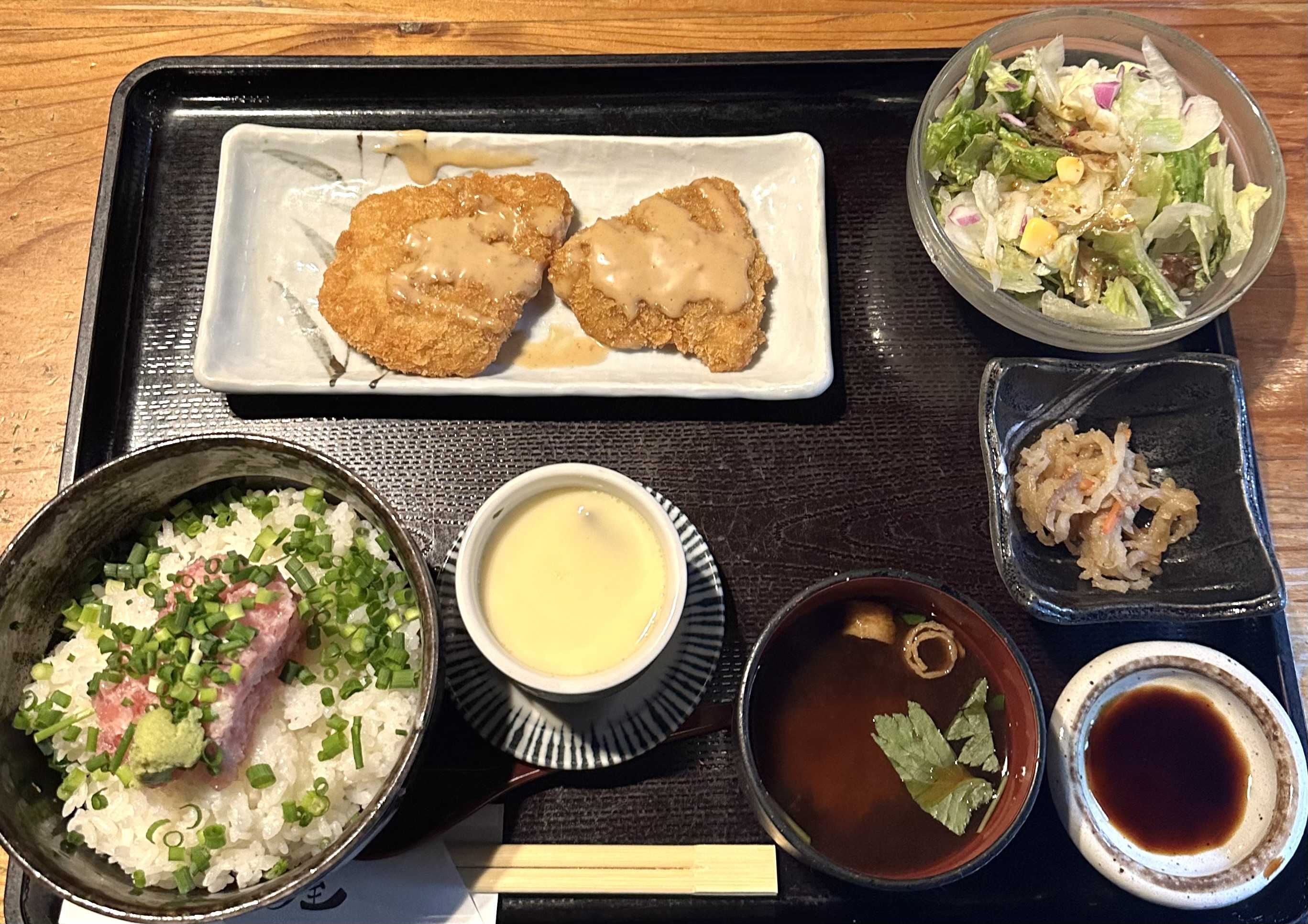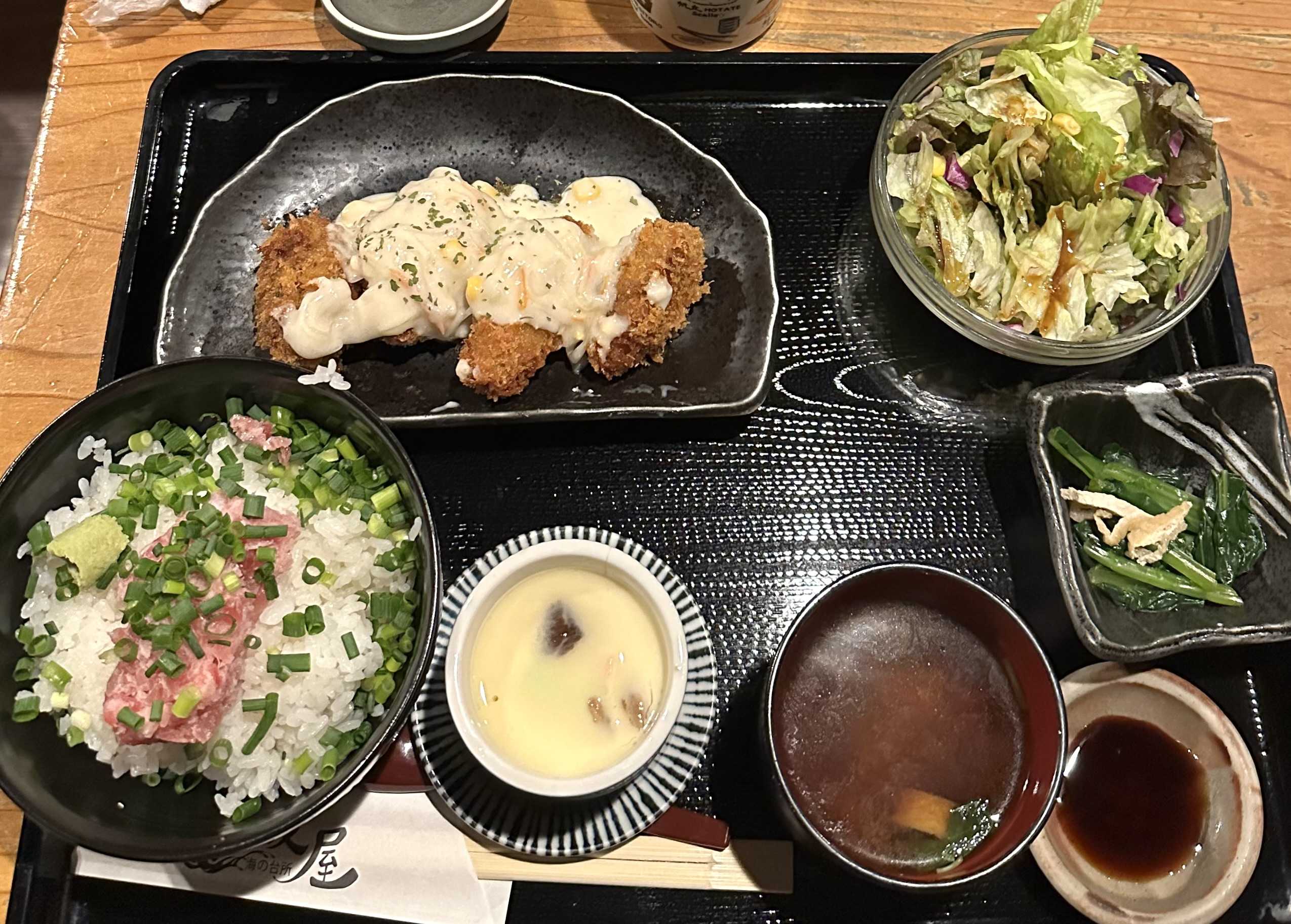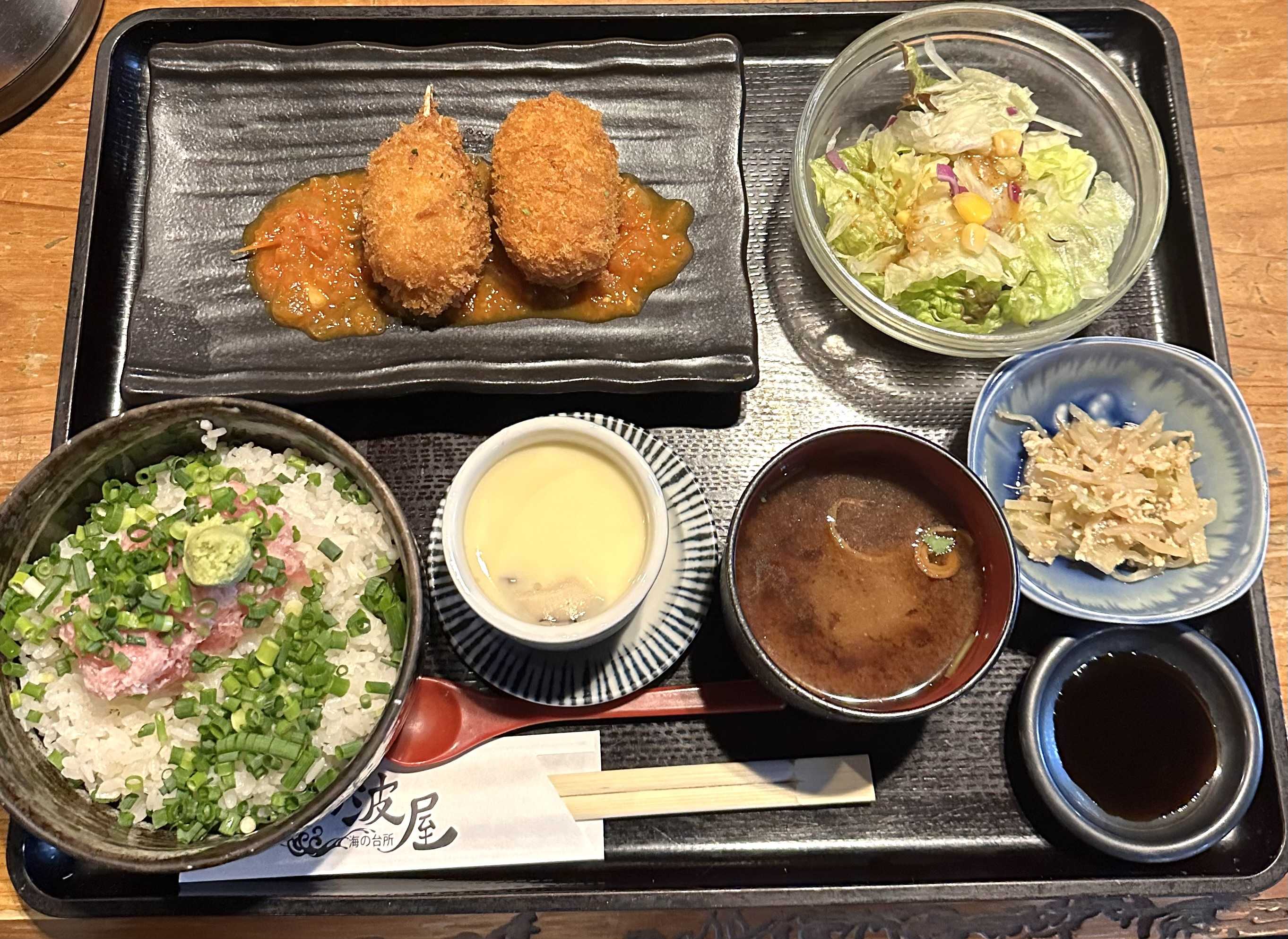 朝はフルグラ、昼はカニクリームコロッケ+ネギトロ丼定食夜は飲み会(始祖鳥)