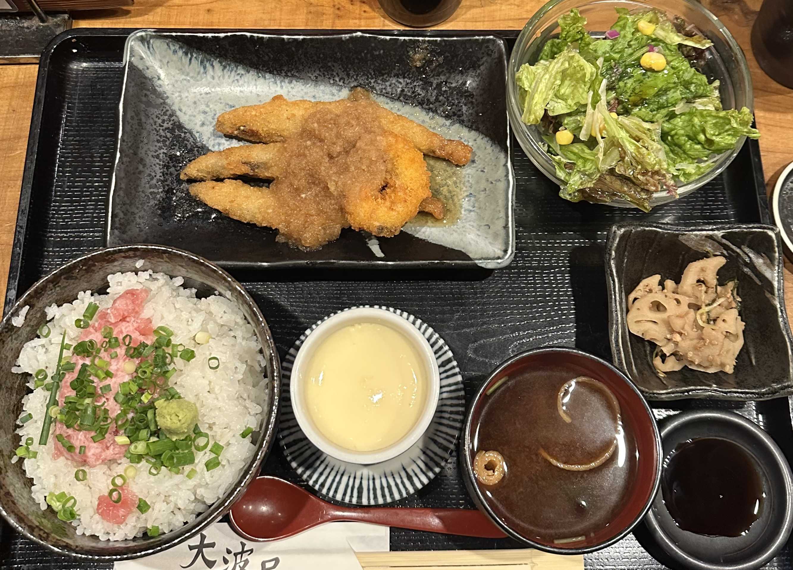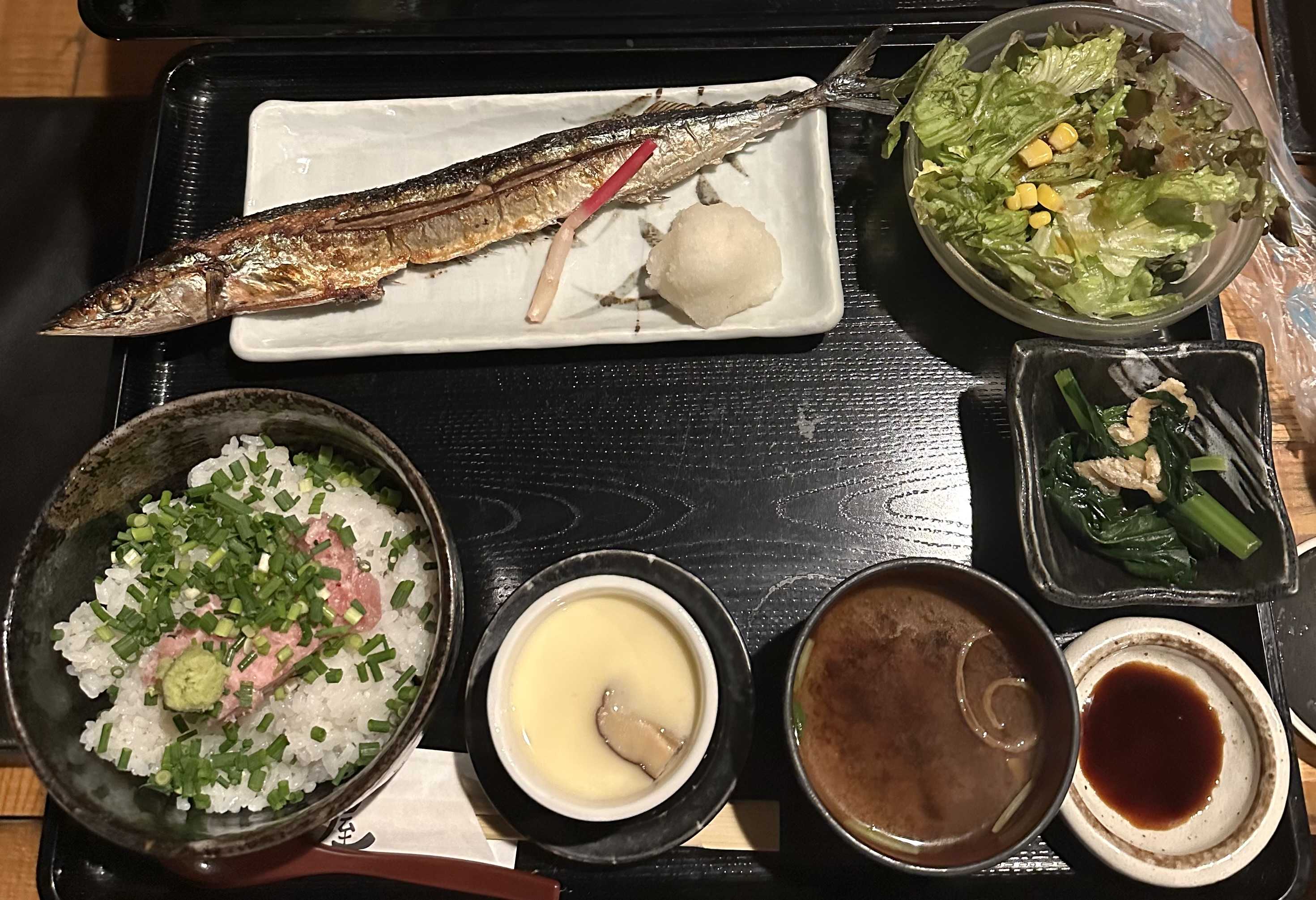 朝はフルグラ、昼は新さんま塩焼き+ネギトロ丼定食夜は飲み会(さかなやま)