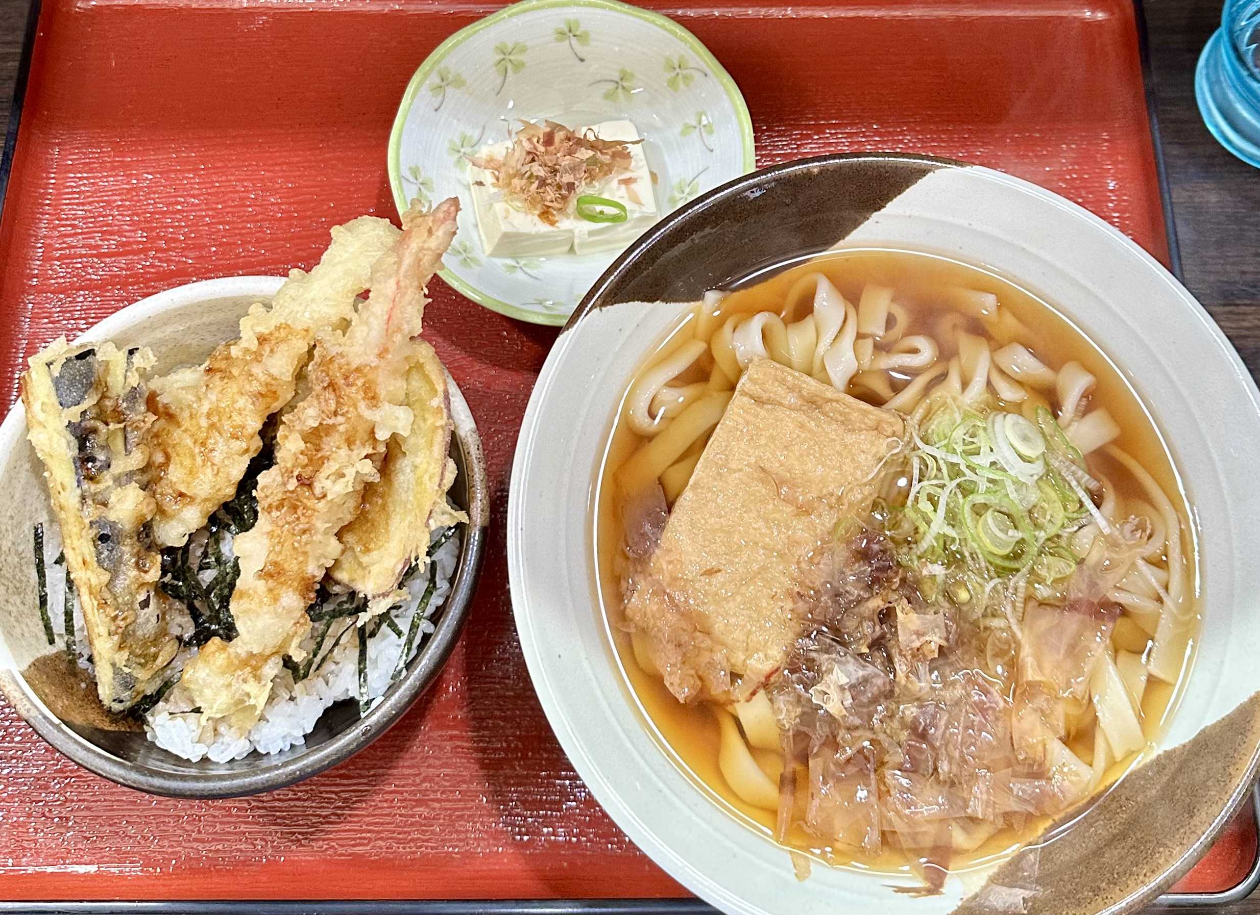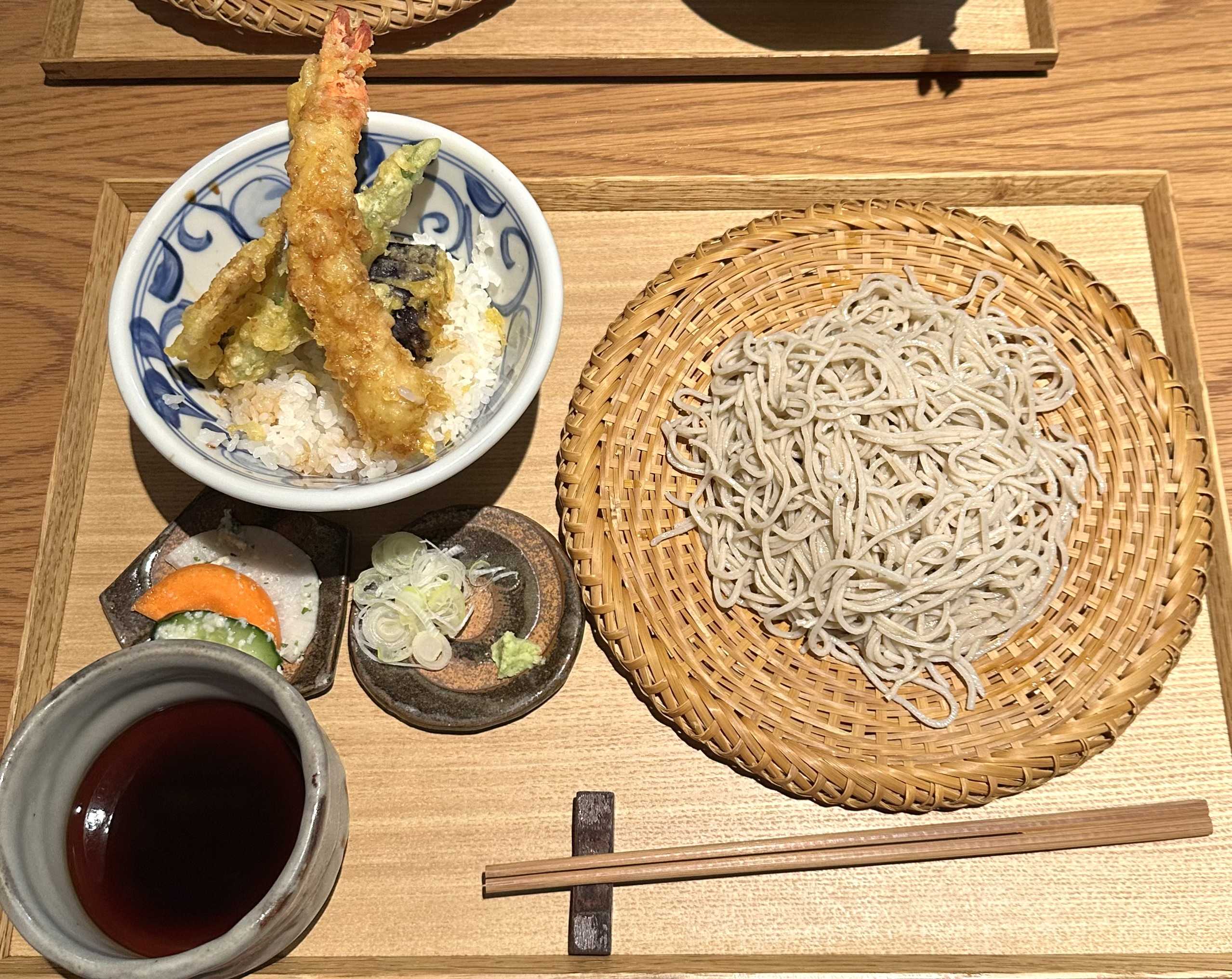 朝はフルグラ+ヨーグルト、昼は蕎麦+海老天丼セット夜は寿司+とり天+サラダ