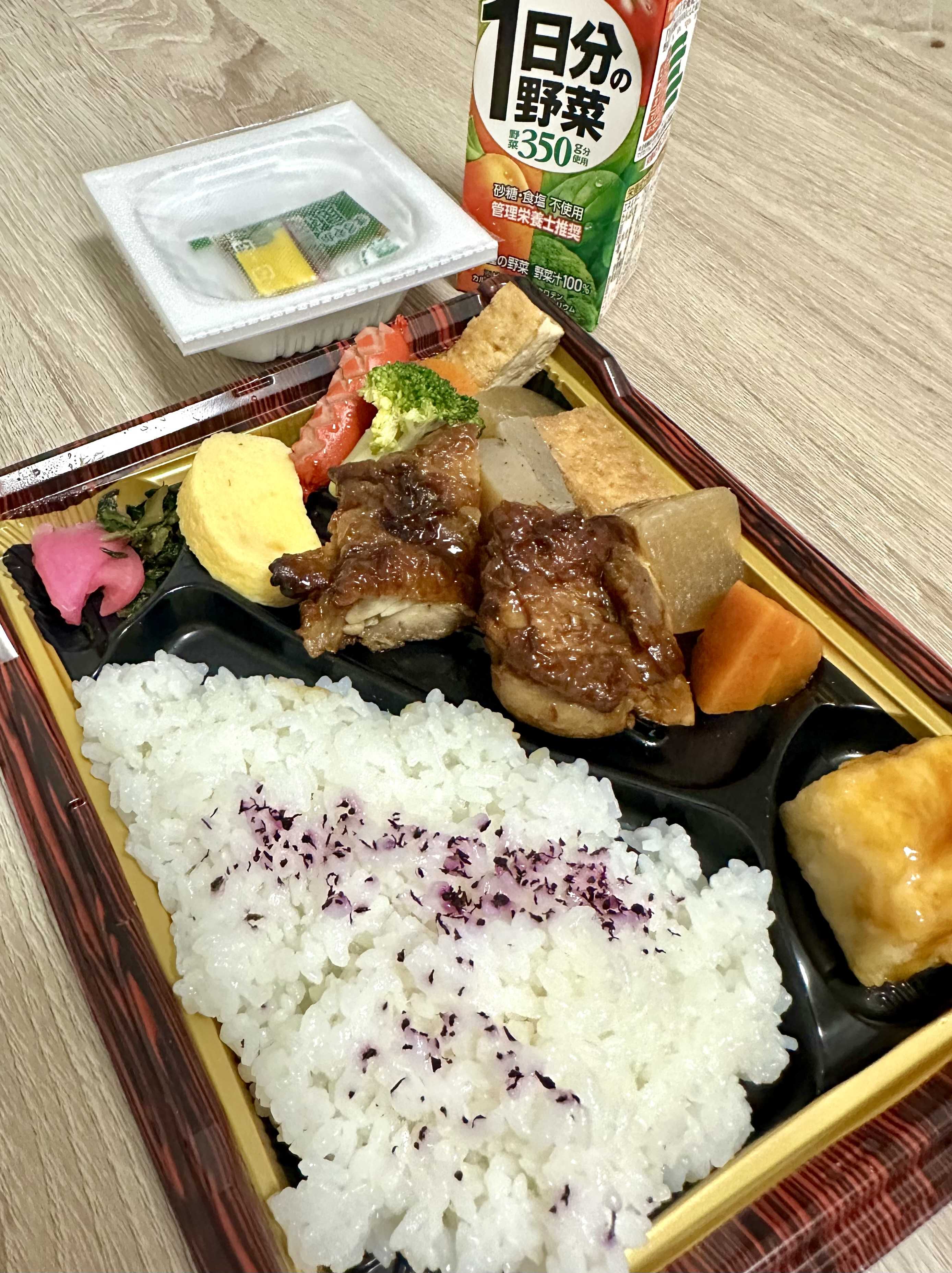 夜は照り焼きチキン和風弁当+納豆+野菜ジュース