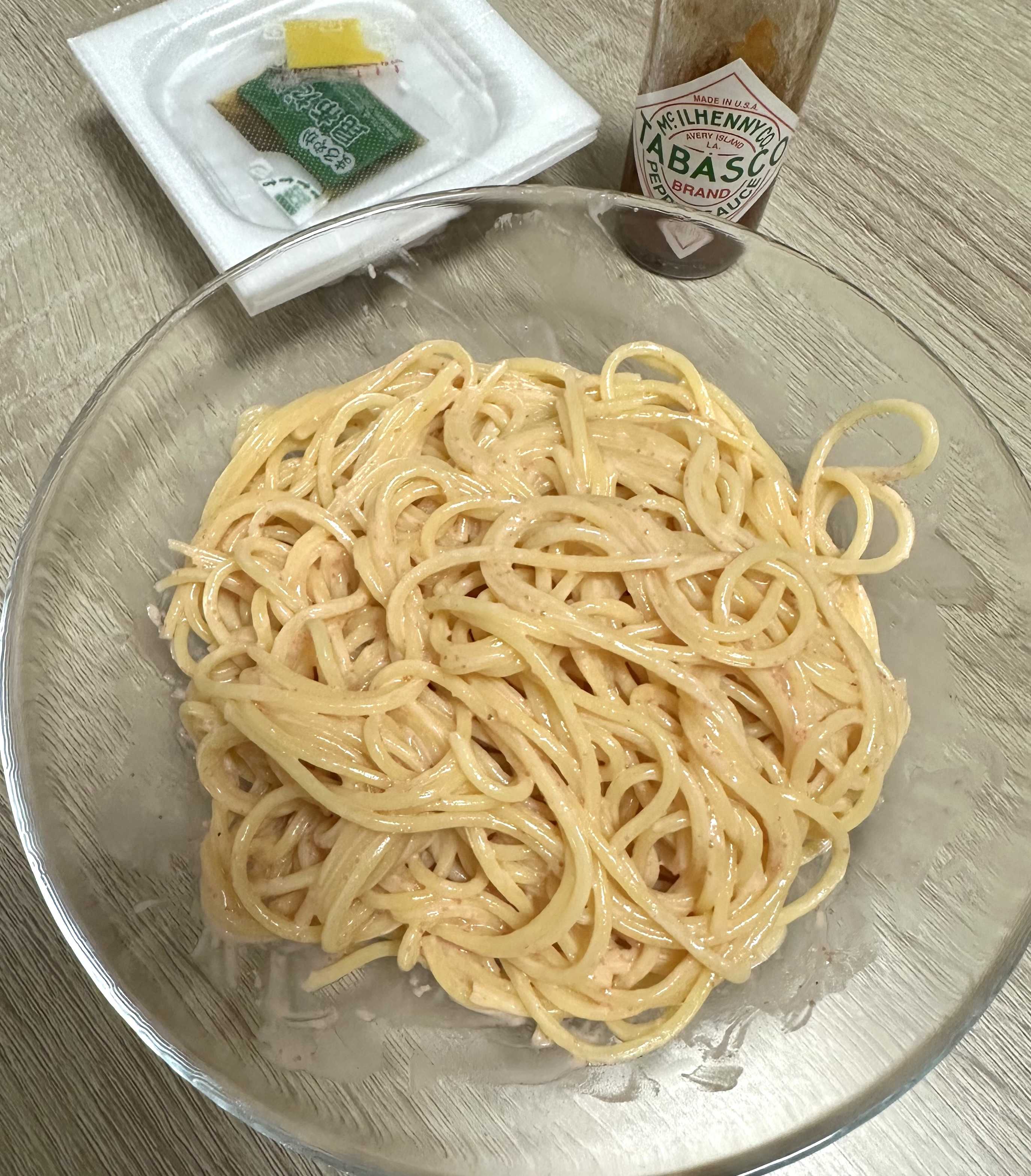 夜はスパゲティ(タラコクリーム)+納豆+サラダ