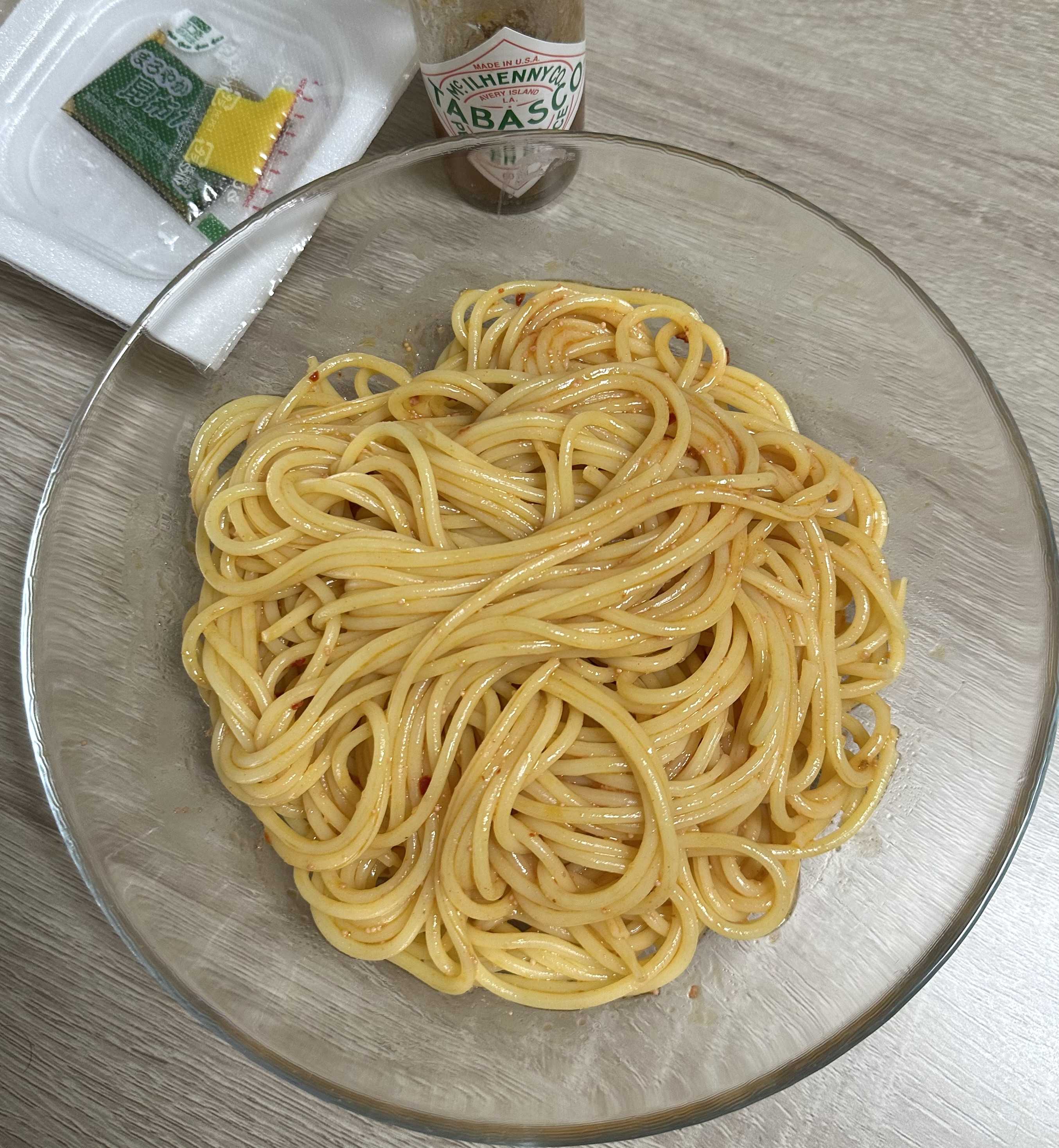 夜はスパゲティ(明太子ソース)+納豆+サラダ