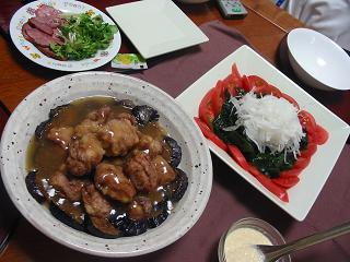 さぁ、今日からはいつもどおりの内容ですもう、いつの晩御飯なのかわからないくらいに画像はたまってしまっていますこれは、安上がりメニューでも、そこそこボリュームはあるんです豆腐の豚肉揚げ豆腐はだいたい16等分位に切ります(パックを開けたら、横に半分さらにそれを1cm厚さに切り分けます)薄切りの豚肉を巻き付けて小麦粉をまぶして油で揚げます野菜やきのこを添えてどうぞ味付けは、今日はナスの素揚げとあんかけにしました醤油と砂糖で甘辛く炊いてもいいですよ 玉葱のサラダそして、またまた登場マヨポン新玉葱のスライスとわかめとトマト私が考えるマヨポンとのベストなバランスのサラダです生の玉葱もしっかりと水にさらせば辛くないし、子供も喜んで食べてくれます新玉葱は甘くて生で食べるにはもってこいですよね奥に見えているのは、今日の旦那ちゃんの一品「スモークタンとカイワレ」です甘~い 甘い サラダたまねぎ3k スモークタン 私はペッパータイプが好き♪ランキングに参加しています いろんなレシピをみてみよう!