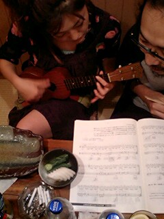 台風なのに、台風だから?台風でも、みんな集まる松屋なのでした。6日は東京に台風上陸。珍しいぃー。なので早々と仕事を切り上げて、松屋へ。台風だから家でじっとしてないとならないから、だから、会社から早くかえらされたというのに。バイトでもないケド、ついつい寄ってしまうなぁ。最初は一人だったけど、なんでか、台風なのに(笑)ぞくぞくと常連さん集まる。しまいにはウクレレ演奏会がはじまり、「きみといつまでも」を伴奏しつつ歌い始めるUIKとワタクシ。ママに何度も音程でダメだしをされてもなおせなかったナ。でも、オンチなわけじゃないから、そこんとこよろしく。「夜空の向こう」が弾けるようになるとかっちょいいのにナ。本日の写真は、真剣にウクレレ弾いてるUIKと、真剣に楽譜を追ってるABEちゃん松屋は平和そうでしょ?外はすんごい風と雨なのに(笑)Sumi