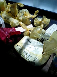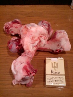 三連休前の木曜日はバイト行ってきた。なぜなら来週の火曜日、お休みさせてもらうからなのだ。で、これ、なんだと思いますか?ミートちゃん(お肉屋さんで、お店の名前がミートプラザなのでミートちゃんと呼ばれてます)が、持ってきた、豚の骨。でっかい。どーするのかと思ったら、常連さんのYKY家の犬たちのエサ用に持ってきてくれたのだった。なにせシェパードが2匹だったっけかな、あと、なんとかって珍しい名前の大型犬がいるので。しっかし、こんなの食べてるのかぁ、ヤツラわと思った。ほんと立派な骨なのよ。Sumi