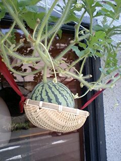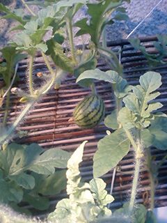 よぉくみると・・・スイカでしょ?ママが店の前のプランターにスイカの種を植えて、ほっといたら生えてきたらしい。つるが店の壁に張り付いてて、なかなか夏っぽい演出してます。そんなこんなしてたら、スイカが、まぢスイカらしきものがなっているでわありませんか。 小スイカ、実物かわいかったんだから。なぜ過去形かというと。その後、ママがプランターに生えたネギを採取した際、誤まってスイカの茎、それも「なってるスイカの茎をどーも切っちゃったみたいなのよねー、水あげてもしぼんだまま復活しなくてぇー、よくみたら切れちゃってたの」なんて言ってました。で、月曜日、小鉢に半分になった小スイカの残骸があり、ココロなしかさびしい気持ちに。どうも、WNBさんと味見したらしい。「小さくても甘いのよー、スイカの味するから食べてみなさいよ」って ・・、食べてみたけどね。確かにスイカの味してたなァ。Sumi