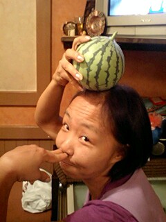 祭りだったよ。HSAくん松屋の前で甚句歌ってました。でも、松屋のカウンターでもウクレレ弾いたり(あ、それはワタシかw)、神輿担がないけど飲みに来てた常連さんで満杯。松屋の外のプランターにひょっこりできたスイカを切ることになりました。 1.まず、WNBさんが比較のために頭にスイカをのせる。 2.みんなでスイカに包丁をいれる。WNKの手も写ってます。 3.で、こんなかんじに。 4.こんな風に盛り付けてみました。 自家栽培スイカ、意外に甘くておいしかったのでした。Sumi