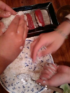 酢めしの匂いが漂ってくるなぁと思っていたら、これだ。店にあったマグロを短冊切りにしたものがお皿にのせたのがでてきて、何をはじめるのかと思えばYuraの握り寿司。つかさ、ちゃんと手を水に濡らして握らないとベトベトだから。ギターの練習をしていたWnkも参加。あっとゆう間にできあがり。さび抜きだったけど、ママがわさびを持ってきてくれたので、この中の2個にわさびを塗っていただきまぁーす。おいしかったよ。ひとつはびちゃびちゃなかんじだったけど、それでもおいしかった。しっかし、Yura食いすぎ!小学生低学年にはみえませんから。