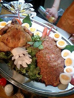 「真夏の昼ののんべぇ会」は松屋に集合!というわけで11時までにぞくぞくと常連さん達が松屋集合。その間、ママがスイカくん2号を気遣って落ちないようにカゴを設置していたのに感心して写メールすることにした。「カゴ取り付けてる間も、3人の人から話しかけられちゃったわよ。このスイカのことで」なんて言ってました。みんな気にかけてくれてるのネ。渋谷まででて、半蔵門線で表参道までトコトコ歩く。そするとありました。「星のなる木」ここで、MTFさん夫婦と合流。個室で、きれいにテーブルセットがしてありました。「真夏の昼ののんべぃ会」のはじまりぃー。前菜、またしても撮り損ねた。というわけで、次のお料理がでてくるまで、みんなとにかく飲み続け、つまみがないと酔っ払うぅ!とかいってたけど、結局飲んじゃうんだよねぇ。で、ひーちゃんが下のコンビニでつまみを買ってきてくれたり、個室だし、料理長が身内だったりするので、ちょっとだけやりたい放題?(笑)ランチだったからか、お弁当形式ででてきました。これに飲み放題がついてるけど、飲み放題メニュー以外の焼酎とかつけてくれるわ、ワインたのめばボトルでだしてくれるわ、やりたい放題でTGO料理長の名誉を傷つけてないかとちょっと心配になりましたが。大丈夫だったのでしょうか。 つづくSumi