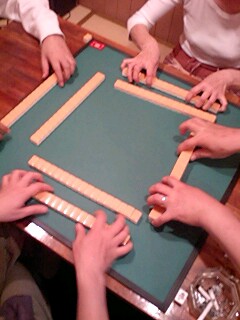 何をしてるかというと・・・・マージャンです。もー、びっくりしたつの。いきなりやることに決まってたから。MTFパパでしょう、SEKさんでしょう、Kenちゃんとママ。11時でさっさと仕事を切り上げ、マージャンの用意。つか、土曜日なのになんであんなに少なかったんだ?お客さま。あ、連日いろいろとイベントがあったからか?んー、でもなぁ。で、女性人(ママを除く)SHKさんとMTFママとわたしは3人でずぅーっとお話。さすがにわたくし、3時で帰宅させていただきましたがっ。結果はSEKさんのひとり勝ちだったらしいぃよ。で、みなさん解散したのは朝の6時だったとさ。みんな元気だナァ。