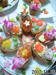 昨日、動物いなり寿司にトライしてみました。これで3回目です。回をかさねるごとに、少しずつ進歩してきたような…。昨日は、のーまーの妹のかなちゃんにも手伝ってもらったので、かわいくできました!作る時間3時間、テーブルにのせて5秒後、たんなる稲荷寿司に逆戻りしてました(TДT)はいはい、ちびちゃんたちのとり皿の上に、うさぎやねこやぶたのうずらのたまごがズラリwこんなもんですwこのおすしを思いついた、宮澤真理さんに感謝です(*^0^*)
