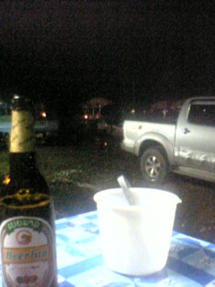 雨が降ってきた。野外になっている客のテーブルには大きなパラソルがかけられる。しかし、私は一人なのか、私だけ建物の屋根の下に案内された。焼鳥と焼きアヒルは食べてしまい、ビアラオのボトルは2本飲んだ。引き上げようと思っていたが、仕方なしに?ビアラオもう1本だ。画像のピックアップの荷台の上に見える光は対岸のタイのナコーンパノムのだ。