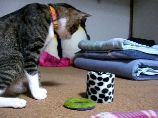 りくです。 ひまわり、猫友の会でココヤムさんからお土産をもらってきたにゃ。 cocoさん、やさしいにゃ。僕たちにもおみやくれるなんて、ステキなヒトだにゃ。 ありがとにゃ。 鬼ひまわりの代わりに、お姉さんになって欲しいにゃ。(←りくお、心の叫び) さ~て 今日はどっちで遊ぼうかにゃ。 5,000円のマタタビ入り手作りおもちゃにしようかにゃ? それともこの豹ガラのおもちゃにしようかにゃ? なやむにゃぁ・・・ きめたにゃ!! 今日はこっち!! ねずみさん♪ねずみさん♪そこからでてくるだにゃ!! にゃ?ちゅっちゅちゅっちゅ鳴くにゃ♪おもしろいにゃ♪ ね~ずみさん♪もうい~かい?? まぁだだよ♪