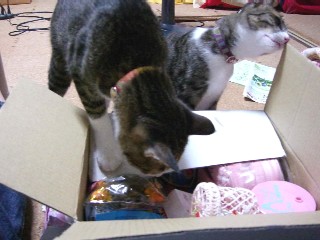 ひまわりさん お届ものデスヨ あらうみお嬢様 かわいげなポーズでどうしたのかしら? あらりくくん あなたの視線の先には何があるのかしら? あらこーたろー ・・・・・みっちみちデスネ 段ボールが来ると、順番に入って居心地を確かめるフシギなにゃんずたち