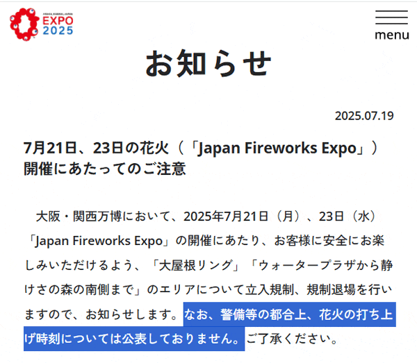 8/23開催の #JapanFireworksExpo において、安全確保のため一部エリアで入退場規制が行われます。