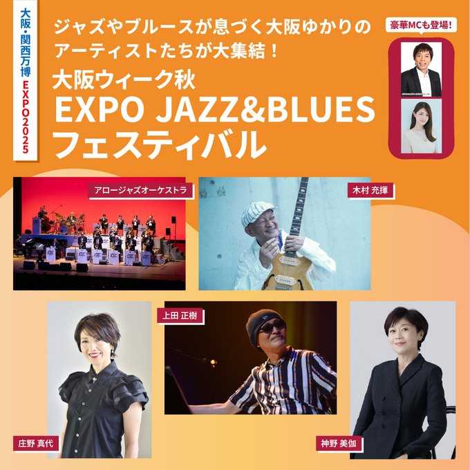 EXPO JAZZ&BLUES フェスティバル大阪文化の多様性・開放性を象徴するジャズ・ブルース界から大阪にゆかりのあるレジェンドアーティストたちが集結します。豪華アーティストたちとともに、1日限りの至高のステージを創り上げます。大阪の音楽文化が結集する、熱く、深く、心に響く特別な一日。音楽の力を全身で体感してください。MCは、大阪ウィーク夏でも会場を大いに盛り上げた今田耕司と元乃木坂46の松村沙友理の大阪愛溢れる名コンビが再び登場します!(大阪ウィーク秋 「EXPO JAZZ&BLUES フェスティバル」)・出演アーティストは1970年代から現在まで第一線で活躍を続けるその圧倒的な歌声と存在感が唯一無二の輝きを放つ京都が誇るソウル・R&Bシンガー上田正樹。・そして、“天使のダミ声”と称される独特のハスキーボイスと魂を揺さぶる歌いまわしで、「最高のヴォーカリスト」との呼び声も高い、大阪ブルースの伝説・木村充揮。・「飛んでイスタンブール」「モンテカルロで乾杯」など数々の名曲で知られ、世代を超えて愛され続ける大阪出身のシンガーソングライター庄野真代。・さらに、演歌・ラテン・ポップスとジャンルの垣根を超えて活躍し、国内外から高い評価を受ける実力派シンガー神野美伽も登場。・バックを務めるのは、大阪の誇る名門ビッグバンド、アロージャズオーケストラ。(万博会場内 EXPOアリーナ「Matsuri」)A~E、車イス席は抽選予約による申し込みが必要ですが、フリーエリアが用意されています。開催概要開催日時:2025年9月4日(木)14:30~16:00(開場13:30)予定会場:万博会場内 EXPOアリーナ「Matsuri」スーパーセール 大阪・関西万博限定100円OFFクーポン!大阪ウィーク秋 「EXPO JAZZ&BLUES フェスティバル」2025年9月4日(木)MC:今田耕司、松村沙友里 アーティスト:アロージャズオーケストラ、上田正樹、木村充揮、庄野真代、神野美伽https://t.co/zEWARPZjBM pic.twitter.com/5cJjbSd209— URA?定価並みで購入した日記 (@Umitosake145951) September 1, 2025