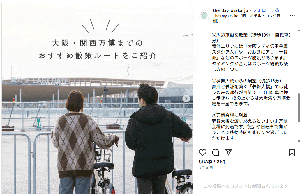 8月13日、万博会場から帰れずに取り残された人が4万人近くいました。万博会場は陸の孤島。どうして紺のようなことになったのでしょうか?万博会場への公共交通機関(鉄道)が1本しかなかったのが大きな要因だと思われます。西ゲートからのバスが利用できない場合、何か方法がないかなと思案していると、「The Day Osaka(旧:ホテル・ロッジ舞洲)」のインスタグラムが目に止まりました。(The Day Osaka(旧:ホテル・ロッジ舞洲)Instagram)舞洲エリアの景色を楽しみながら万博会場へ徒歩で移動できるとのことです。「The Day Osaka(旧:ホテル・ロッジ舞洲)」から万博会場までの所要時間は、約45分。このルートを利用すれば、版各会場から脱出ができるかもしれません。夢洲と舞洲をつなぐ「夢舞大橋」は徒歩で通行可(約15分)東ゲートをでて、夢舞大橋を渡り、最寄りのバス停「舞洲食品流通センター前」までの移動距離は約2km、所要時間は約40分です。その後、大阪までの移動時間は公共交通機関を使い約40分。【参考リンク】・ホテル・ロッジ舞洲から万博会場まで、自然を感じながらのんびり散策|【公式】The Day Osaka・2系統舞洲アクティブバス | 北港観光バス(夢洲(万博会場東ゲート)から舞洲(舞洲食品流通センター前)までの経路)例えば、21時に東ゲートを出て徒歩で「舞洲食品流通センター前」ヘ移動し、21:58発のバスに乗ることができれば、22:36に大阪駅に帰ることも可能です。最大の課題は、北港観光バスの輸送能力ですが、万博会場からの脱出ルートの想定は多いに越したことはないので、今後の訪問に備えて記録しておきます。(北港観光バス時刻表「舞洲食品流通センター前」)(乗換案内 舞洲食品流通センター前→大阪)・ ・ ・ ・万博会場から帰れなくなった人々への備蓄の水の配布が午前4:07頃、少し遅い気もしています。と思ったら、一部は午前1時頃に配布されていたようです。【関連記事】・大阪関西万博会場情報 Disaster prevention and Safety 防災・安全 午前4時。万博協会が災害用に備蓄をしている水を配り始めました。東ゲート近くの一部の自販機では、売り切れとなっているところも多く、大勢の帰宅困難者が受け取りに来ています。 pic.twitter.com/5qYei7dMAB— 高橋大作(ABCテレビ ニュースデスク/防災士) (@abc_daisaku) August 13, 2025午前1時頃、大阪ヘルスケアパビリオンでは水が配られていましたまた、一部の飲食店、パビリオンでも#おは朝 でも4時頃で遅いと協会の対応を批判されてましたが、こういうことも含め正確に伝えてほしいですね批判ありきの報道では困ります#ABCテレビ— いつき🌈大阪・関西万博ナビ📣旅行ライター/Yahoo!ニュース エキスパート クリエイター (@n_itsuki) August 13, 2025一夜明けて『オールナイト万博』というガチ勢でも滅多に経験できない、非常にレアな唯一無二の時間を楽しく過ごせました。私が実際に目にした現場の状況を詳しく呟いていきます。○万博周辺のお客さんから怒号は飛び交っていない○急患者の為に皆んなスマホのライトで位置を知らせて助け合ってた…— ワク²させてよ!!からかい上手の西兄さん(超武闘派×無党派)💙🤍 (@west1124) August 14, 2025
