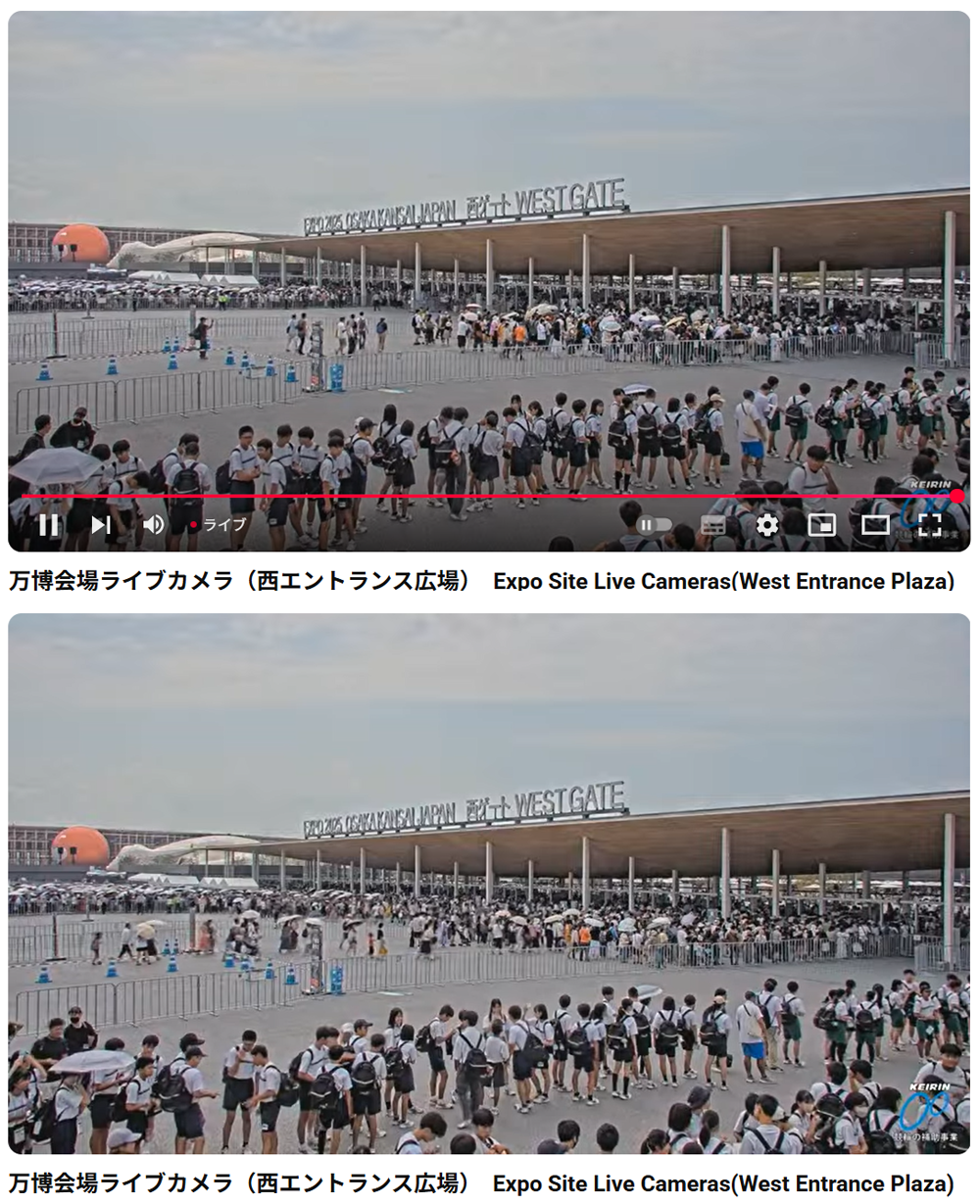 ある日の西ゲートの様子をライブカメラで見ていました。10:05になってもゲート中央のレーンには人が居ません。中央のレーンは9時入場枠の人がゆうゆうと入れるようです。10:07頃10時入場枠の解放が行われました。10:08頃、10:13頃あっという間に空きレーンが埋まっていきます。待機列後方の右側にいた人が、解放されたレーンに駆け足で移動するので、これまでの待機列の順序は無視されます。長時間待った努力が無視され蹂躙される瞬間です。もっと良い並ばせ方はないのでしょうか???8.30 ひさしぶりに東ゲートより早朝入場して驚きました。東ゲートでは整然とレーン前に列を作って並んでします。セキュリティー会社がそのように誘導しています。なぜ、西のセキュリティー会社はそのように列を誘導しないのか?なぜ、万博協会はアンケートで要望する人が一定数あるにもかかわらず対応しないのか?(ある日の西ゲート ①10:05頃 ②10:07頃)(ある日の西ゲート ③10:08頃 ②10:13頃)(Expo2025 大阪・関西万博 会場ライブカメラ Expo Site Live Cameras - YouTube)万博東ゲートの並びがキレイすぎて、西ゲートの運用の下手さがそのまま放置されていることに疑問が湧きました💦当たり前のことですが、西ゲート前でレーンごとに並ばせないのは何故なのか?運営上層部は把握していないのか?西は東を見習って欲しいですね pic.twitter.com/UG36mbzZqL— URA?定価並みで購入した日記 (@Umitosake145951) August 30, 2025 【関連記事】・大阪関西万博 来場予約が取れない、7日前抽選に応募できない ・万博会場 あまり待たずに入場できるか検証してみました・大阪関西万博 ライブカメラなどによる西ゲート入場についての考察・これは便利! 大阪・関西万博 EXPO2025 非公式MAP・万博覚え書き2 7日前抽選・2か月前抽選のイベントまとめ・万博達人のおすすめ万博見学プラン1(半日版)引用メモ・7日前抽選・2ヶ月前抽選 締切間近の イベントまとめ 非公式・当日予約状況 - 大阪・関西万博 2025・サウジアラビアパビリオン ナイトショー「水の物語」 ・大阪関西万博 9:30にオープンするパビリオン【参考リンク】・【万博ライブカメラ】大阪・関西万博 東ゲート前の混雑は?会場やゲートの様子を生配信 Expo2025 LIVE CAM OSAKA Kansai Japan MBS・【LIVE】万博ライブカメラ 水上ショー・花火も打ち上げ ウォーターフロント周辺の今の様子 Osaka Kansai Expo Live Camera 2025 MBS・【万博ライブカメラ】「東ゲート」の人出は?【LIVE CAM】EXPO2025, OSAKA, KANSAI, JAPAN, Here we go! YTV・【万博ライブカメラ2】シグネチャーゾーン【LIVE CAM】EXPO2025, OSAKA, KANSAI, JAPAN, A Spectacular Show of Water & Air YTV・【万博ライブカメラ】EXPO2025 タクシー乗降場乗務員用ライブカメラ・【Expo2025 大阪・関西万博 Future Life Village TEステージ・【ライブ】LIVE streaming Expo2025 Osaka, Kansai, Japan【夢洲・横浜冷凍屋上】 ABC・【大阪・関西万博】【LIVE CAMERA】(夢洲・横浜冷凍屋上カメラ) TVO・Expo2025 大阪・関西万博 会場ライブカメラ Expo Site Live Cameras - YouTube【参考リンク2】大阪・関西万博公式Webサイトほか・当日予約状況 - 大阪・関西万博 2025 非公式・Expo2025 大阪・関西万博 会場ライブカメラ・7日前抽選・2か月前抽選のイベントまとめ | 万博イベントカレンダー 非公式・主要施設のスケジュールを見やすく整理 | 万博イベントカレンダー 非公式・レストラン・グルメ - 万博GO 非公式・パビリオン・イベント予約の最新状況について~お早めに来場予約して事前の観覧予約をご活用ください~・明日の万博情報 - いっしょに、いこな!大阪・関西万博・毎日更新:パビリオン・イベント、混雑予想、当日券販売など・イベント検索 Event | EXPO 2025 Visitors 掲載漏れ多数あり・ピックアップイベント・ナショナルデー・スペシャルデーカレンダー