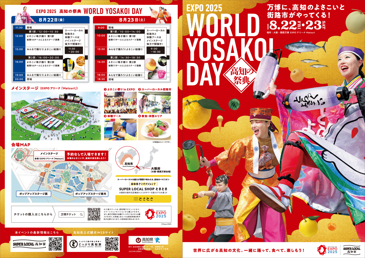 EXPOアリーナのイベント、生配信してもらえると臨場感を感じることができていいですね。EXPO 2025 高知の祭典 WORLD YOSAKOI DAY壮大な自然、心躍る美食、独自の文化や祭り。日本が誇る極上の田舎❝SUPER LOCAL 高知家❞の魅力を体験できる特別な2日間!〇よさこい祭り in EXPOよさこい発祥の地・高知がお届けするスペシャルステージ。第1回よこさい祭りで披露された「原点のよさこい」から、個性豊かな演出で活躍する高知・関西のよさこいチーム、よさこいの未来を担うエネルギーあふれる学生チームが多彩な演舞で魅了します。踊る人も観る人も楽しめる総踊りも開催。舞台のチームと一緒に踊って盛り上がろう!〇スーパーローカル街路市300年以上受け継がれ、高知県民にとって特別な「街路市」の趣を会場で再現。高知県の豊かな土地に育まれた産品や、生産者が手塩にかけて作った商品など、さまざまな特産品が一挙集結。県内全34市町村と、本物の日曜市出展者が参加する街路市で、高知県各地の魅力をお届けします。グルメの食べ歩きや買い物と一緒に、気さくな高知の出店者と会話を楽しもう!【参考リンク】生配信・『WORLD YOSAKOI DAY 1日目』大阪・関西万博会場から生中継! 8/22・『WORLD YOSAKOI DAY 2日目』大阪・関西万博会場から生中継! 8/23・【高知の祭典「WORLD YOSAKOI DAY」】 | SUPER LOCAL 高知家(EXPO 2025 高知の祭典 WORLD YOSAKOI DAY チラシ)(大阪・関西万博 リングのなかMAP)【関連記事】・オールナイト万博 Disaster prevention and Safety 防災・安全 ・検証を求む! 8月13日非常事態 万博会場で物資の配布はされたのか? ・万博会場(夢洲)から舞洲への脱出 徒歩ルート