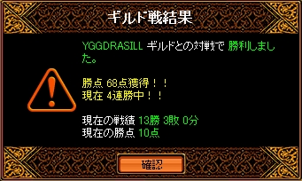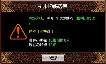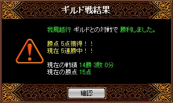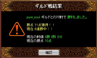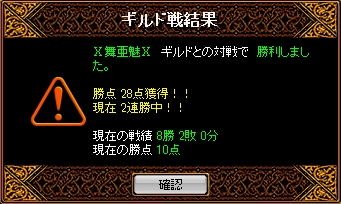 時間=1月24日(月)22時00分場所=ソゴム山脈 / 赤い丘禁止=裏切り結果全体的な集まりはよかったのですが火力は二人…裏切りなしの状態で得点は難しいと思われましたがさすがエース剣士華麗に先制!お見事^^その後も妨害との連携で得点を重ねていくものの相手の剣士さんが烈火マークしてるのに倒してくる…TOPクラスの剣士の実力を思い知らされた感じですねなかなかこちらの流れに引き込めないまま終盤へ終了5分前程にワーム真空が決まり一気に得点をとれたのでその後の展開がだいぶ有利になりました最初から最後まで緊迫したGvで終わった後は疲労感でいっぱいでしたw