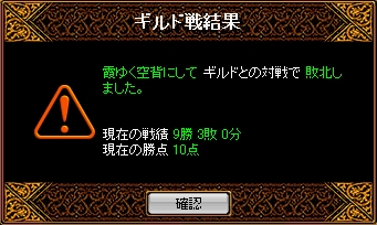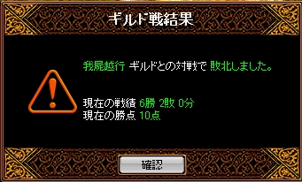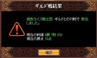 時間=10月4日(月)22時55分 場所=エルベルグ山脈/岩の谷禁止=毒舌・裏切り・花・烈火の通常4点+転生+胴斬り+スイッチ+真空結果こちら10人あちらは11人終始攻められた感じでした。相手もこちらもWIZ3だったのと両方に悪魔がいなかったのでロースコア対決になるとは思っていましたが・・・霊術師さんがうまく腕斬りを使ってきたので全然攻めれることが出来なかったですお互いに火力2でしたがそのへんが勝敗に出たかなと思います敗北から学ぶものは大きいですから次のGvに今日の反省を活かしていきましょう!