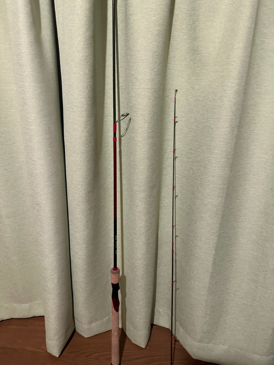 典匠/DJIANG 羽鱗210Lカテゴリ選定理由:中華系釣具の為少し前にAmazonで購入したのだ。マルチピースのルアーロッドだ。送料込み5980円。注文から2日で届いたので、国内に在庫を置いてたのだろう。5ピースでバラすと付属のソフトケースに納められます。リールは付属しません。いかにも中華系って感じのロゴが付いてます。ライトなルアーフィッシングに向いてそうです。DJIANGはおそらくメーカー名なのだろう。THE•中華系ですな一応Kガイドっぽいものが付いてます。本物かはわかりません。リングの材質もわかりません。見た感じよくあるハードガイドとステンレスのフレームだと思います。何やらどこかで見た事あるような気がする鮮やかな赤のリールシートとコルクのグリップの組み合わせです。中華系にありがちなロゴなしリールシートです。トップガイドは....うーん....ロッドエンドは一応盛り上がって握りやすくなっている。中華系には珍しくグリップが長めです。持って振った感じは悪くなさそうだが、5ピースなので実際に使って見ないとわかりません。海で今度使って見ます。