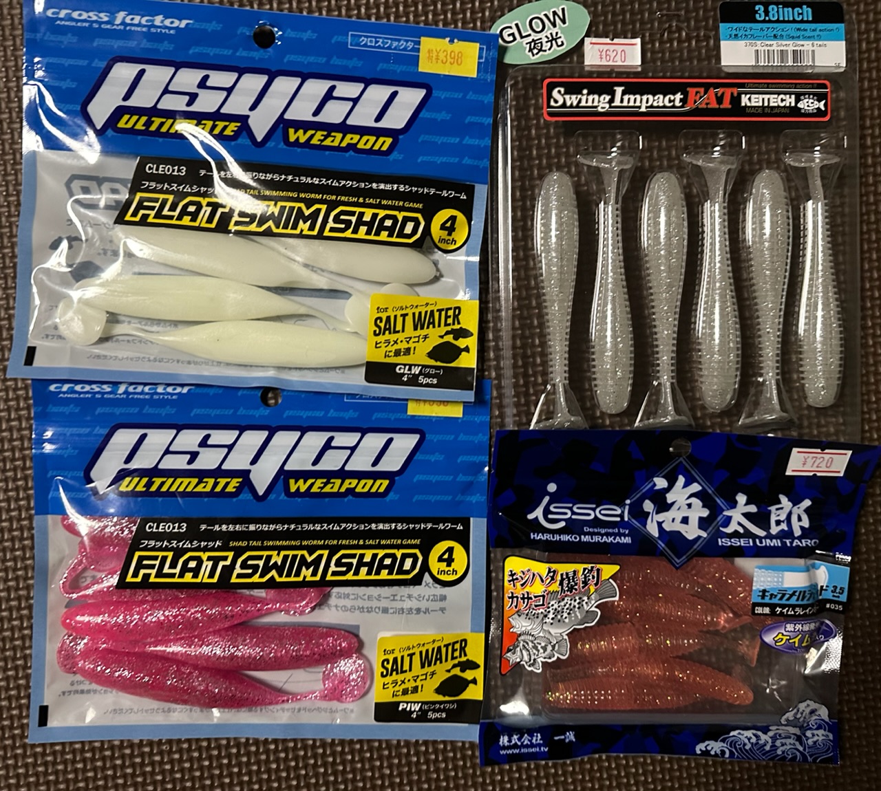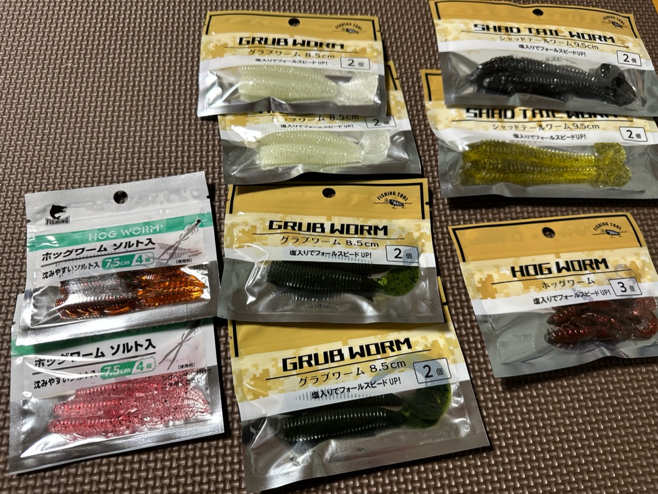 キャンドゥとセリアでソフトルアーを買ってみたのだ。これだけ買っても、1000円に満たない。...代わりにパッケージの中には2-3本しか入ってないが...今回は大きくても小さくても根魚を釣る事を目標に選定して購入した。注目しているのはキャンドゥで買ったこのグラブワーム。なんと夜光です。大きさも良さげで、ソイの夜釣りに効きそうです。...メーカー品とあんまりコストが変わらないような気もしますが。それにしても百均ワームって大半が塩入りですが、耐久性とかどうなんでしょうか...