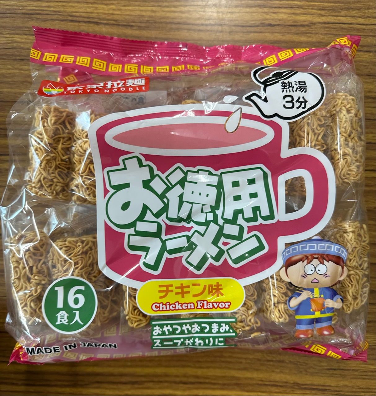 近所のドラッグストアで見つけました。東京拉麺 お徳用ラーメン チキン味チOンラーメンっぽい味がします16食入り。お椀に入る大きさです。お湯は200CC3分経ったら完成。仕事場でバリバリ砕いて紙コップに入れてお湯をかけて食べてます。お弁当のお供に良き。
