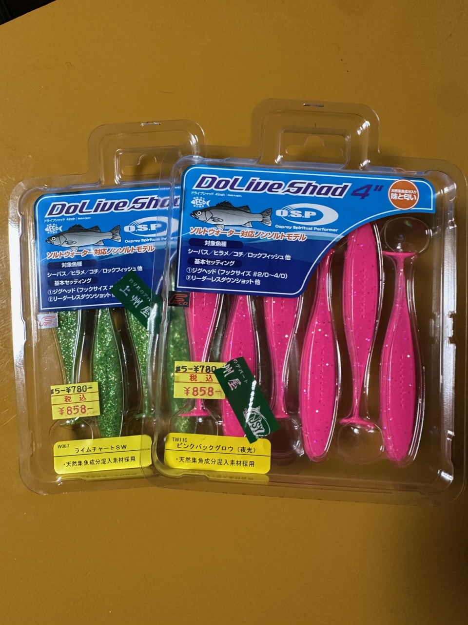 O.S.P社から販売されているドライブシャッドシリーズ。何やら知り合いが海で使ってみて非常にロックフィッシュにあんばいが良いと言っていた。僕の近所の釣具屋でもほんのちょっとだけ取り扱いがあるが、バスがあまり盛んな地域ではないためバリエーションが少なく、手を出さずにいた。ところが今回出張先の近所の上州屋でソルト用のドライブシャッドを見つけてしまった。なかなかどうして、いいあんばいのチャートカラーじゃないか。ピンクの方は夜光まで入っている。思わず衝動買いしてしまった。なかなかどうして、横から見ると絶妙なシルエットじゃないか。形が崩れないようにハードケースに入れて販売してるところにこだわりを感じるぜ。今回は無難な4インチの海用を買ったが、反応が良かったらバス用のビッグサイズを海で試したい。