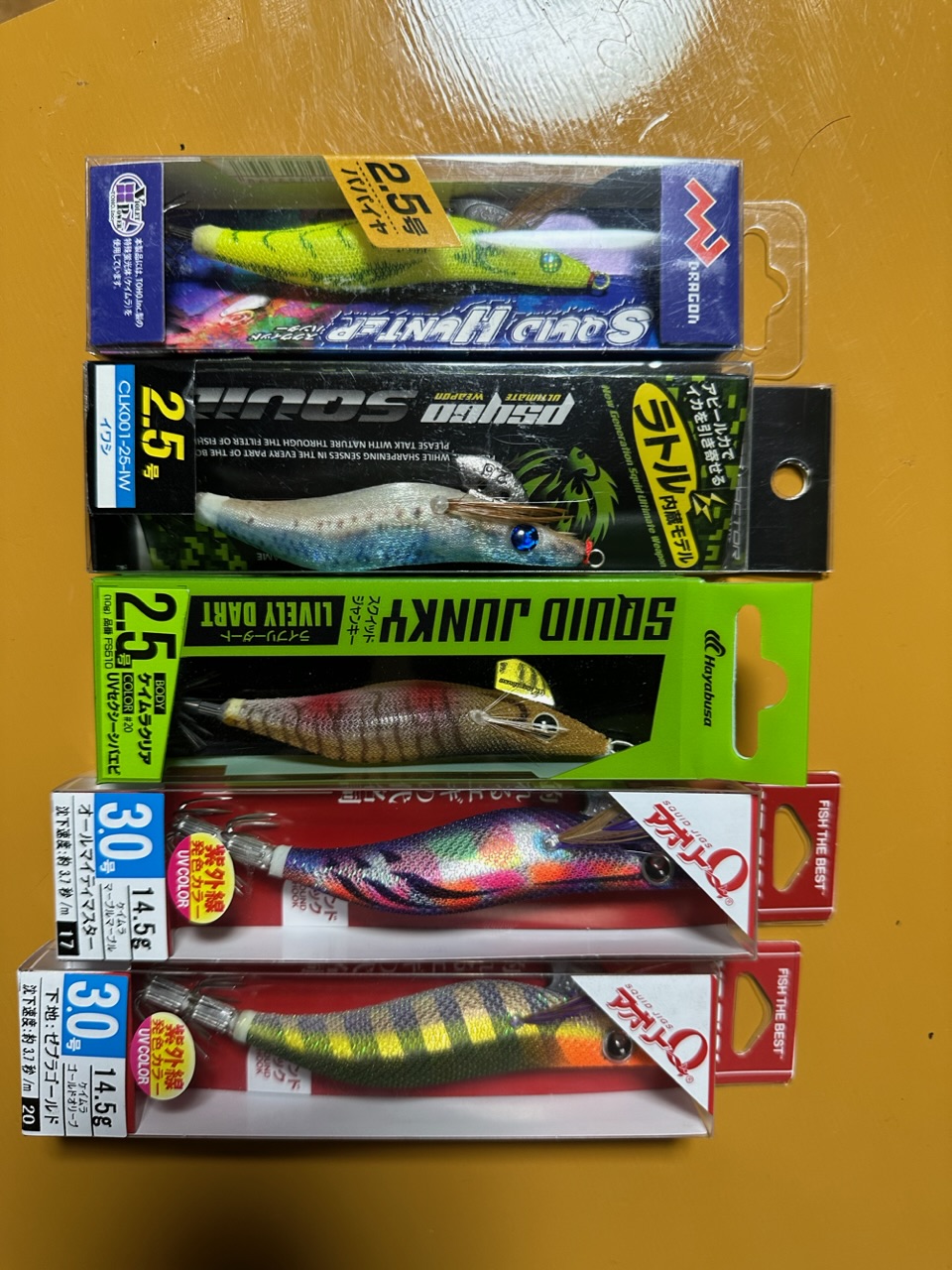 近所の防波堤でそこそこのアオリイカが釣れているらしいので、Amazonで安くなっていたエギを選んで購入した。パタパタのシリーズは今年はテクビイカ釣りで活躍したが今回も活躍してくれるでしょうか。どれも釣れるような気もする。エギングはシロウトなのでよくわからんばい。専用品なんて持ってないのでそれっぽいロッドとリールで見よう見まねでしゃくってみるばい。