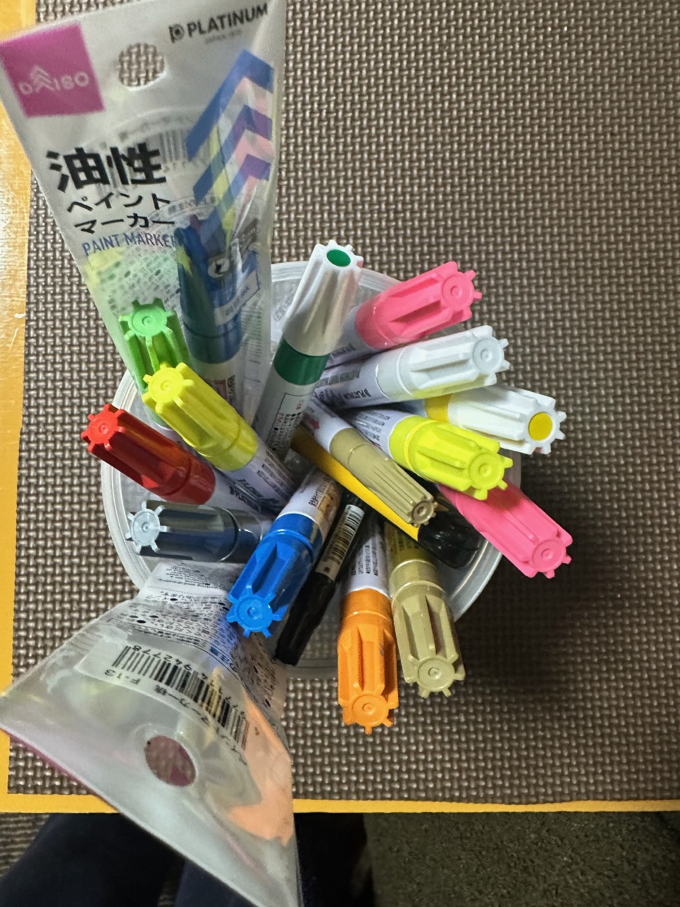 先日購入したダイソーエギ3色のカラーパターン加え、号数のバリエーションもあり攻めたいときやファミリーフィッシングにもうってつけじゃないか。ついでに言えば改造のベースにもいいのではないか?シンカーやハネを改造したり色を変えたりツワモノになればトレブルフックさえつけてしまいそうだ。改造も釣りの楽しみの一つだろう。というわけで改造の手始めに色を塗ってみた。エギに色を塗るには何でも良いわけじゃなくて、色がのりやすい塗料が必要だ。今回は三菱のカラーマーカーを使用した。大体1本200円くらいで買えますよ。派手な色にして目立つようにしてみよう。イカは色彩感覚無いらしいけどピンクとグリーンとイエローを組み合わせてチャート気味に作ったみよう。ホワイトで下塗りすると発色がよくなるぜ。・・・・・・・・・・・・・・????気づいたらサイケデリックな色になってしまった。どうしてこうなった????僕はどうやらセンスがないらしい...