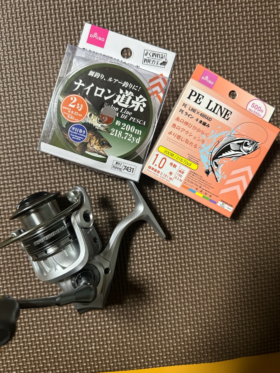アブのカーディナル3 SX2000を主に海の軽めのルアーフィッシングで使っている。深溝のモデルだ。安かったんだよ。シマノやダイワのリールのような巻き心地や繊細さは全くないが、多少ガサツに扱っても壊れないのだ。ガンガン使って使用後はじゃぶじゃぶ水道水で洗ってヒマな時にオイルを刺している。僕みたいなイイカゲンな人間にピッタリだ。そして先日、ラインをそろそろ交換しようと思ったのだ。前回巻いたの去年だし。前回どんなラインを巻いたか記憶はあんまりないがシーガーのPEの0.8か1号をカンで下巻して巻いたような気がする。じゃあ今回はちゃんとラインキャパ通りに巻こうかと思って公式サイトで調べてみるとPE1.5号を150m、もしくは8lbのナイロンラインを150m巻けるらしい。それ以外は記載されていない。そっかあ。2000番のリールのPE1.5?????とりあえずバカ正直にPE1.5号を150mなんて巻いてもしょうがないのでダイソーのPE1号でも巻くことにしました。用途的にゃあ0.8号、0.6号でもいいのだが多少ラフに扱うことも考えて1号でいいや。さてさて困ったぞ。少なくとも公式HP上ではSX2000にPE1号をなんぼまけるかなんて書いてないのだ。自身で直径の差から計算しなければいけない。ダイソーPEは国内生産のPEに比べてだいぶ太いっす。ケイサンしてみるとダイソーPE1号なら173m巻けるらしい・・・実際は滑り止めのナイロンを巻くので150mちょっとくらいになりそうです。ダイソーナイロン2号を20-25回転下巻きしてから巻いたらちょうど150m(3回目のオレンジ色)くらいでちょうどいいあんばいになりました。近いうちに使うのでリーダーも組みました。今年もガンガン壊し使ってやるぜ。