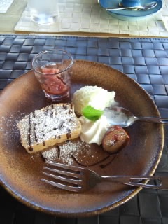 10日からの3連休は夫が私の実家近くの川で(といっても車で30分)釣りをするというので夫婦で実家に向かいました。168号線は連休だからか車が多めでした。11日の釣りの日はあいにく午前中は本降りの雨でしたが、小さなアユを15匹ほど釣ってきました。12日は実家の母を連れて田辺市の病院に入院してる叔母のお見舞いに。写真はお見舞いの帰りに寄った栗栖川町のカフェ ド リッカさんのスイーツプレートです。私はメロンのジェラートが一番気にいりました。最終日は車に長く乗ったので少々疲れましたが、思いがけず帰省でき親孝行?できて良かったです!