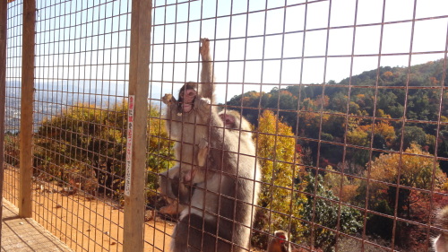ユースホステルをチェックアウトして嵐山モンキーパークへ。ここはテレビで紹介されてて知りました。入園口からひたすら20分ほど登って、山頂兼展望台(標高160メートル)へ。ここには約120頭のニホンザルが野生の状態で暮らしています。山頂には休憩所がありえさが売っていて、金網ごしにのみえさをあげることが出来ます。私はクルミを買ってあげたのですが、上手に割って食べていました。子ザルが木で遊んでいたり、急に喧嘩が始まったりと見ていて楽しかったです。展望台からの眺めもなかなか良かったです。その後、夫の希望でひー様御用達のロシア料理「キエフ」へ。ポルシチやピロシキ、とても美味しかったです!窓際の席だったので眺めもグットでした。店内にはマトリョーシカが飾ってあって、とても可愛かったです。それから、「マヤルカ古書店」へ。就活の用意をだしにしっかり楽しんだ1泊2日でした。^^;写真は金網ごしのお猿さん。