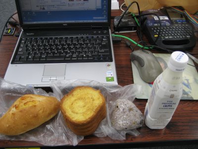 今日も夜仕事なんすよ。雪降るって言ってるのに、大丈夫なんすかねぇ。で、今日の飯。メープルフレンチと、チーズフランスと、晩飯の残りで作ったおにぎり。