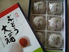 料理教室仲間のHちゃんからいただきました~!季節限定 ぶどう大福@如水庵夏の太陽をいっぱいに浴びてはちきれんばかりに育った種無しぶどうの王様ピオーネ。さわやかな甘味と酸味を丸ごと柔らかいお餅で包み込みました。果皮と実の間に美味しさとミネラルが詰まっています。冷たく冷やして丸ごとお召し上がり下さいませ。~案内文より~とっても美味しいです!!ごちそうさまでした~!!