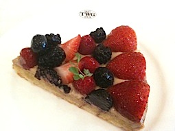 TWG Teaのティールームでベリーのタルトを注文。紅茶はバン ドゥ ローズティ(上の色の濃い方)とシークレット オブ カシミールティ。種類があり過ぎて何を頼んで良いものか迷ってしまう。