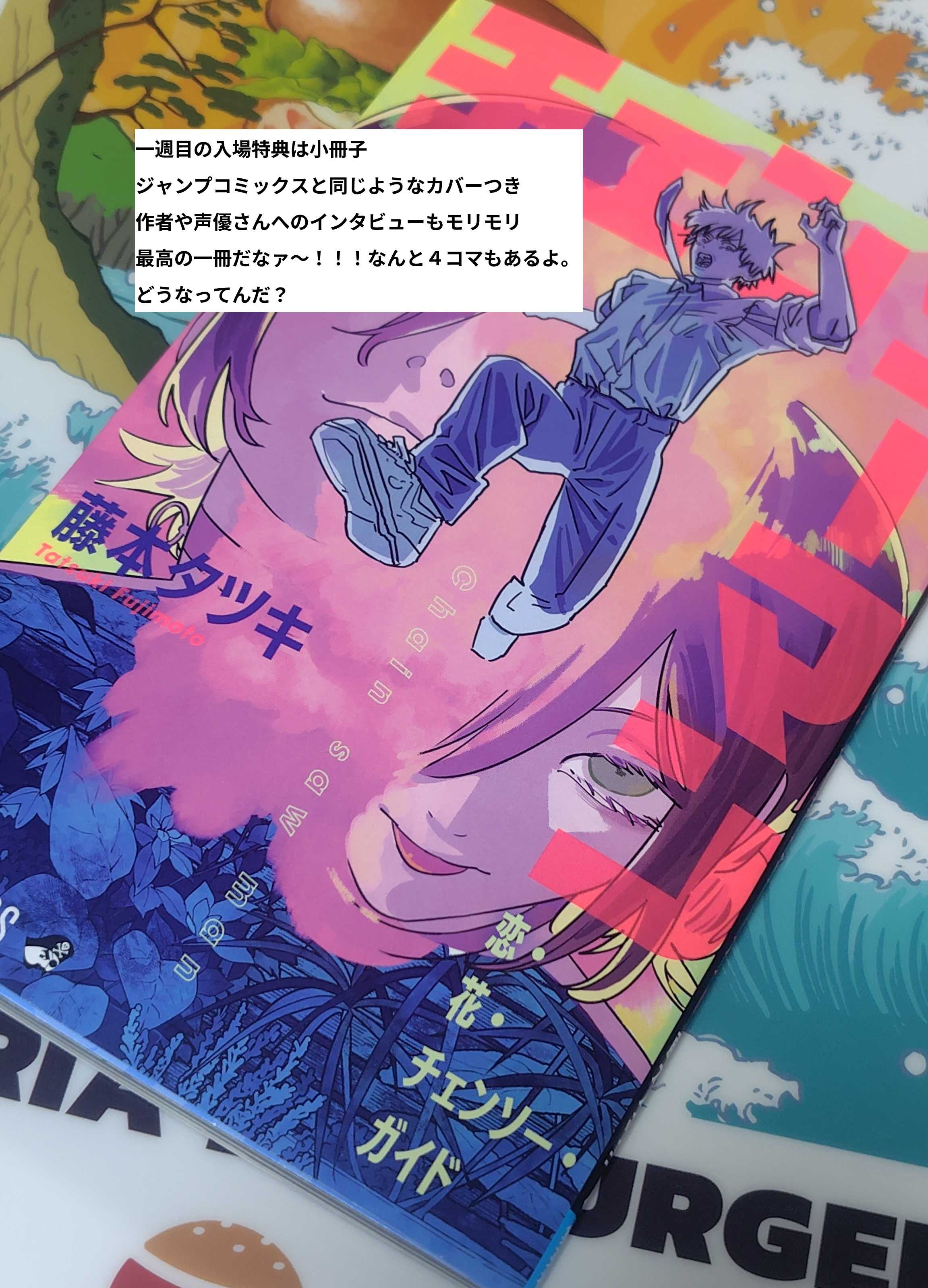 うに~。こちらの記事にて、上映日が未定にも関わらず期待に胸を膨らませていた「チェンソーマン レゼ篇」を先日観てきました。結論:良かった!!!!!!!(更新、大変ご無沙汰しております。チェンソーマンの原作強火オタクです。)記念すべき上映日は9/19(金)(なんと最速上映ということで0時に観られる映画館もありました)身重でなければ最速で観ていたと思いますが、そこはリスクをとって旦那と一緒に翌日の土曜日の朝イチで予約。もうね、どこから話せばいいかわからないくらい本当に良かったのですが、私の感じたことをつらつらと書いていきます。↑入場特典が豪華🟦今の映画ってOP曲があるの? パワーアップしたパワ子を連れて公安まで連れて行くシーンが補完されていました。 アニメでもOPを担当した米津玄師による「IRIS OUT」をバックに、わちゃわちゃと、ときおり差し込む不穏なカット。チェンソーマンの世界にぐっと入り込めます。 アニメ映画って今こんな感じでOPあるのが普通なんですか?🟦バカっぽいデンジとか 劇場版では監督が変更になったため、どのキャラも表情・演技のバリエーションが豊かになっていました。前監督の不満要素の一つに抑揚をかなり抑えたディレクションというものがあったので(静の描写はとても良かったのだけれど。) 雰囲気が崩れない程度の崩したギャグシーンも最高に良かったですし、だからこそ原作と同じようにシリアスなシーンとの緩急が出ていたと思います。🟦レゼとのデート レゼの実力チラ見せシーンがありますが、ロシア語のメロディは映画のために新たに作ったとパンフレットにありました。また、詩はタツキが考えたものだそうですね。知らなかったです。 プールのシーンもいやらしい感じはそぎ落とされていたように思います。個人的には乳首の加筆がなくてよかった(笑) 合間にはさまる捉えられた蝶と蜘蛛はデンジとレゼで、捕食(チェックメイト)まであと少しという表現でしょうか? そして、原作の表現をどのようにアニメーションにするか楽しみにしていた夏祭りのシーンですが、少しぼやけてキラキラしていて、違和感なくアニメーションにも落とし込まれていました。🟦花火~初変身~ビームがデンジを抱いて逃げるシーン わかっていてもこの一連の流れは緊張感がありました。原作よりも血が出ていて美しい花火と血まみれの口がグロテスクでよかったです。 ここで初めてボムとしての姿が出ますが、原作でも大好きだった変身するシーンが強化されていてすごく良かったです。感動のあまり震えましたね。ここから怒涛のバトル展開です。🟦戦いの補完・爆発の表現 バトルシーンはカットがたくさん増えていました。 爆発シーンはCGじゃなくて手書きなのか?という質感で、ジブリの爆撃のようなヌルっとした迫力がありました。好みの問題ですが私はCGが進化しているとはいえ、アニメーションは手書きならではの質感が好きなので、とにかく大満足です。 しかしパンフレットでは手書きかどうかの明言がなく不確定…もしかしたらどこかのインタで言及があるかも? VS台風は少し長く感じたかな…この辺りから表現がアーティスティックになってよくわからんな?と思ってしまって。けどレゼのセリフにあるように「メチャクチャ」なのは確かなので、カオスを楽しむのがいいと思いました。リピートすればまた違った発見があるかもしれませんね。 しかし改めて酷い規模の悪魔被害だ・・・🟦レゼの最期 ラストはマキマさん直々に手を下しますが、レゼの独白が良すぎました。 何度も読んだのに、ピッタリな声と演技がつくだけでこんなにも心に響くものなのかと(´;ω;`) 熱くなる目頭に、鼻をすすることしかできませんでした。 映画の後は食欲不振になるくらい、心に穴があきます。 まぁ結局お昼は食べましたが。改めて、素晴らしいアニメーション映画に落とし込んで下さった制作陣の方々には頭が上がりません。そういえば、Xでは公式から光の点滅に気をつけろ(要約)と警告があったため、軽度のてんかん持ちの私はサングラス(ほぼ透明)で一応対策しましたが、台風~レゼのバトルシーンの一部で光がしんどかったくらいで、目を逸らせば耐えられましたので参考までに。また、もし原作が未履修なら、総集編か原作を先に読むことをおすすめします。コナンみたいな丁寧な世界観の紹介が無いので。パンフレットはこんな感じで厚みのあるカバーがついていました。映画館でパンフレット買うのいつ振りやろ?入場特典が第四弾まであるらしいので、物によるけどなるべくリピートしたいです。それでは~。