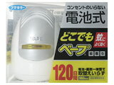 どこでもベープ蚊取り 120日セット (シルバー)レビュー評価:5.0(5点満点) レビュー数:1価格:1,050円商品説明「どこでもベープ蚊取り 120日セット (シルバー)」は、コンセントのいらない電池式蚊取りです。音の静かな高性能ファンが、殺虫成分を効率よく拡散させます。タテに置いてもヨコに置いてもOK。背面のフック穴を利用して壁や柱に掛けることもできます(フックは別途ご用意ください)。電池・薬剤一体型なので取替えも不要。1日8時間使用で約120日間お使いいただけます。暗闇でもわかるパイロットランプ、120日薬剤カートリッジ1個付。無香料。医薬部外品。カラーはシルバー。効能屋内/蚊成虫の駆除、屋外/蚊成虫の忌避用法・用量4.5-10畳の部屋では蚊成虫の駆除に、屋外では蚊成虫の忌避にお使い下さい。1日8時間の使用で約120日間(計960時間)使用できます。使用方法*使用時間の経過とともに薬剤の色が変化しますが、ランプが点灯しなくなるまで(電池が切れるまで)使用できます。*電池と薬剤は共に約960時間が寿命です。1.器具のフタを取り外します。(器具のフタをなくさないよう注意してください。)2.カートリッジを本体の奥まで挿入して、フタをしめます。*器具の切れ込みとカートリッジの凸部分が合うようにセットしてください。3.スイッチを押すと、ランプが点灯し、薬剤が拡散します。*ランプが点灯しなくなったら新しいカートリッジとお取替えください。(明るいところではランプが見えにくいことがあります。)4.カートリッジを取り出す場合は、器具のフタを取り外し、カートリッジを取り出してください。使用上の注意してはいけないこと●閉め切った部屋で、長時間換気をせずに使用しないこと。●1日の使用時間は12時間以内にとどめ、それ以上は使用しないこと。●スイッチを入れっぱなしにしないこと。通電中は成分が連続して揮散するので、使用しない時は必ずスイッチをOFFにすること。相談すること●万一身体に異常を感じた場合や、薬剤の薬剤容器(薬剤カートリッジ)を食べたり舐めた場合は、本品がピレスロイド系メトフルトリンを含有する殺虫剤であることを医師に告げて、診療を受けること。その他の注意●定められた用法・用量を厳守すること。●本品を直射日光が当たるところや高温になるところに置かないこと。●器具の吸気口や吹き出し口をふさがないこと。●故障の原因となるので水などの液体をかけないこと。汚れた場合は乾いた布などでよく拭き取ること。●強い衝撃や振動は故障の原因となるので器具を落としたり投げたりしないこと。●故障の原因となるので、器具の分解・改造・修理をしないこと。●廃棄時以外は薬剤カートリッジを分解しないこと。●使用中及び使用後は乳幼児・小児が薬剤に触れることのないように注意すること。●アレルギー症状やカブレなどを起こしやすい体質の人は薬剤に触れたり、吸込んだりしないよう注意すること。●薬剤粒は容器内に被包されていますが、皮膚に対して刺激性があるため、薬剤容器を分解するなど直接触れないよう注意すること。●薬剤が手についた場合は、直ちに石けんでよく洗うこと。●器具本体のランプが点灯しなくなったら新しいカートリッジに交換すること。●スイッチをいれた直後や屋外で風がある場合などは、充分な効果が得られないことがあります。保管及び取り扱い上の注意●直射日光、高温を避けて、小児の手の届かない場所に保管すること。●長期にわたり使用しない場合は、カートリッジを器具からはずし、ラップやポリ袋などで密封して冷暗所に保管すること。●使用済のカートリッジはすみやかに器具から外すこと。電池が液漏れするおそれがあります。成分有効成分:メトフルトリン(ピレスロイド系)その他の成分:ジブチルヒドロキシトルエン、着色剤、粒状パルプ、他1成分廃棄の方法*廃棄時以外は分解しないこと●使用後のカートリッジは次の手順にしたがって分別し、カートリッジはプラスチックゴミとして、電池と金具はそれぞれ適切に捨てること。1.コインをみぞに差し込んでひねり、電池ボックスを引き抜いてください。2.電池ボックスのフックをはずし、ふたを開け、電池と金具を取り出してください。3.電池ボックス底の穴にペン先やようじなどを差し込み、端子を取り出してください。返品についてこちらの商品は返品方法が異なります。詳しくはこちら。 ブランド:どこでもベープ日用品 > 虫よけ・殺虫剤・忌避 > 蚊取り用品 > 電子・電池式蚊取り > 製造販売元 フマキラー セット内容:器具1個、薬剤カートリッジ1個(電池内臓)サイズ(外装):幅147*高さ117*奥行68(mm)JANコード: 4902424424560広告文責:ケンコーコム株式会社電話番号:0120?22 55 66デイリー ホワイトエッセンス子供向け ハウス