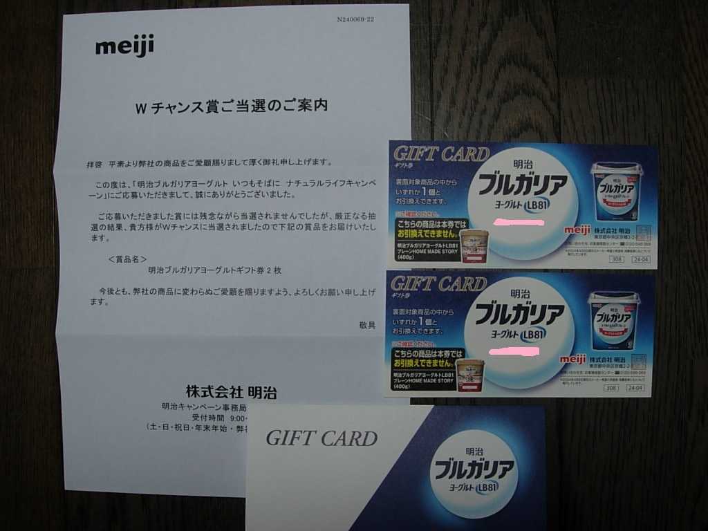 簡易書留で届きました明治ブルガリアヨーグルト いつもそばに ナチュラルライフキャンペーンWチャンス賞:明治ブルガリアヨーグルトギフト券2枚 (4,240名枠)全国区の明治ブルガリアヨーグルトキャンペーンで多分初めて当たりました!Wチャンス賞でも凄く嬉しい!満足感がありますきっと当選者数が多かったからでしょう明治様、ありがとうございました送料無料 [トクホ] 明治 ブルガリアヨーグルトLB81 プレーン 400g×12個 クール価格:3,132円(税込、送料別) (2025/6/1時点)