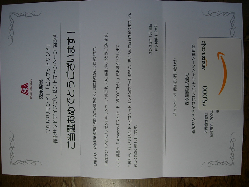 2025年の初荷がやっと届きました!簡易書留にて森永サンドアイスプレゼントキャンペーン第3弾Amazonギフトカード5,000円分 (200名枠)無事登録完了2口応募でした第1弾と第2弾にも各1口応募しましたがはずれ高額なので当たりにくいかなと思いましたが第3弾でようやく当たってとても嬉しいです森永製菓様ありがとうございました[アイス] 森永製菓 ビスケットサンド 119ml×6個価格:1,923円(税込、送料無料) (2025/1/16時点)