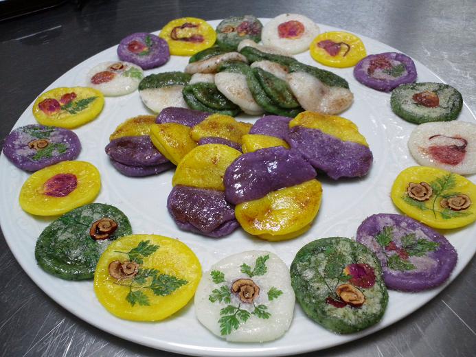 6月の韓国伝統餅は宮廷菓子の・ファジョン(花煎)・チュアク(造岳) です。二種類の餅菓子ですが、お花やナツメをあしらったものがファジョン。あしらっていないのをチュアクといいます。5月の韓国料理教室メニューでもやりましたが、また生地に混ぜ込むものやあしらうものにより見た目は全然変わってきます。でも、作り方は同じでした。もち粉に塩、湯、を入れ色だしをするのに、ピンクには紫いもパウダー、黄色にはくちなし、みどりはよもぎを混ぜます。平たい餅にはナツメや食用花をあしらい、半月をふたつくっつけたのには、ナツメの超みじん切りと蜂蜜、シナモンを混ぜて餡にしたのをはさみます。ホットプレートで軽く焼いて、バットに砂糖とシナモンパウダーを引いていたとこへ落とします。熱々のうちに作業をするので、必死なのでただただ、餅同士がくっつかないようにします。味は塩味が効いたシンプルな餅です。でも、こんな見た目に可愛らしい餅はやはり日本では見た事がありません。本当に愛らしくてずっと見ていたいお餅です。韓国でも家庭ではやらないらしく、宮廷料理を食べに行くと出てくる時もあるらしいです。全体的にはとてもシンプルでシナモンパウダーが効いてるお上品なお餅でした。↓今月は2日続けて美味しそうなものが見れて幸せです彩りがあまりにもキレイで「わァ~~」と思わず声が出てしまいましたほんとうに丁寧な作業で昔の人はほんとうに手間暇かけられて作られたのだと思うと頭が下がりますこれは1度作ってみたいなァと思いながら幾度も画像を眺めていましたひとつひとつラップするので人にあげるのも喜ばれますよね今月も美味しそうな画像をありがとう