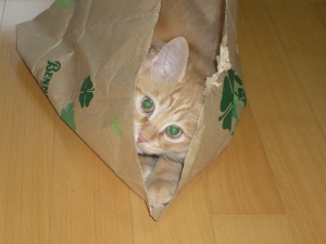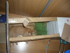いたずらざかりのタビー。今日のお仕事は・・・このダンボールのガラクタ見たいのが何かというと・・・原型はこれ。手作りキャットタワー。(笑)無理やり乗せられてるようにも見えるけど。^^;小さなハサミひとつで頑張って作ったんだよ。。でも、今は無残に半分に分解され・・・いっぱい遊んだもんね。^^<タビーの反論>一段目高すぎて上るの大変だしー。かなり不安定で、上で遊んでたら何回も倒れるしー。。そして、草は。。猫草。別名、タビーの小庭。(笑)たなの上に置いてあったんだけど、落とした。で、砂がこぼれてる。そこで、ご機嫌よろしくごろにゃんしてたもんだから、野良猫もびっくりの室内汚れ猫のできあがり。。そのときわたしは電話中で、いや~な音が聞こえてはいたんだけど。。こうきたか。ぼくは無実にゃー! ここから出すのにゃーーー!タビー・・・ドア開いてるよ。。