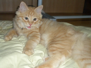 いきなりですが、キミだれ?ぼく、タビー。あれ、タビーくんってこんなんだっけ?(笑)いやいや、2代目タビーを襲名したんです。^^先月、1代目タビーが旅立ってからしばらくはもう猫は飼わないつもりでいた。タビーの病気の原因だった、パルボ菌は感染力が強いので、いくら殺菌しても心配がつきまとうから。が、先日レオが帰ってきてご飯も食べず、服も着替えずコンピューターに。何かと思えば、猫を探してる。唸りながら、この子がかわいい、あの子もかわいいって。^^;でも、みんなワクチンを受けてないからうちに連れて来るわけにはいかない。が、いた。韓国ではあまりワクチンをうたないけど、4ヶ月のこにゃんこですでに3回もワクチン接種をしたこがいた。で、飼い主に直接電話して聞いて、以前お世話になった動物病院に電話して・・・それでレオは動物病院の先生に、こにゃんこの状態を説明し、うちで飼っても大丈夫だろうという返事を得た。でもワクチンでパルボ菌はほぼ回避できるとはいえ、100%はありえないから、わたしは気が進まなかった。でも、もうレオは止まらない。とりあえず見るだけ見てみよう、って速攻飼い主に電話して今から見に行きますって。^^;そしてそして・・・ご対面したのは4ヶ月とは思えないほどに大きく成長した、食べすぎで今にもお腹が破裂しそうなねこちゃんでした。。広告には、ペルシャ猫・雄・4ヶ月とあったけど。。雄 - 間違いない。立派なたまたまがついてたから。ペルシャ猫 - あごのモサモサ毛と多少横広がりの顔にペルシャの名残あり。 が、鼻が高い。(鼻がでてる) そして、なにより胴が長い! たぶんお父さんは、ミーアキャットかプレリードッグ。4ヶ月 - 発育よすぎ。 目がすわってる。(笑)なんか違う気がした。そして、猫は台所やテーブルの上も我が物顔で飛び回る。絶対に違うと思った。(笑)が、私を決心させたのは、その家の幼稚園くらいの息子くん。猫を振り回し、こね回し、雄たけびを浴びせかける。猫はパニック状態。お母さんも動物が嫌いということで。。家ではおねえちゃんだけがかわいがってくれるらしい。タビーの心の声が聞こえた。「僕をここから連れ出して!」(笑)連れ出しました。保護しちゃいました。(笑)で、うちに来たタビーはストレスの為か、恐怖の噛み猫で・・・うちに来て一週間ちょっと。わたしの噛んだらダメ講座を受け、大分ましになってきた。でも最近赤ちゃんに戻っちゃったみたいで。。手をグーパーしてニギニギ。私の指を必死になって、ちゅぱちゅぱ吸って。。ママのことでも思い出してるのかな。^^でも、こんなに大きいんですよ。(笑)